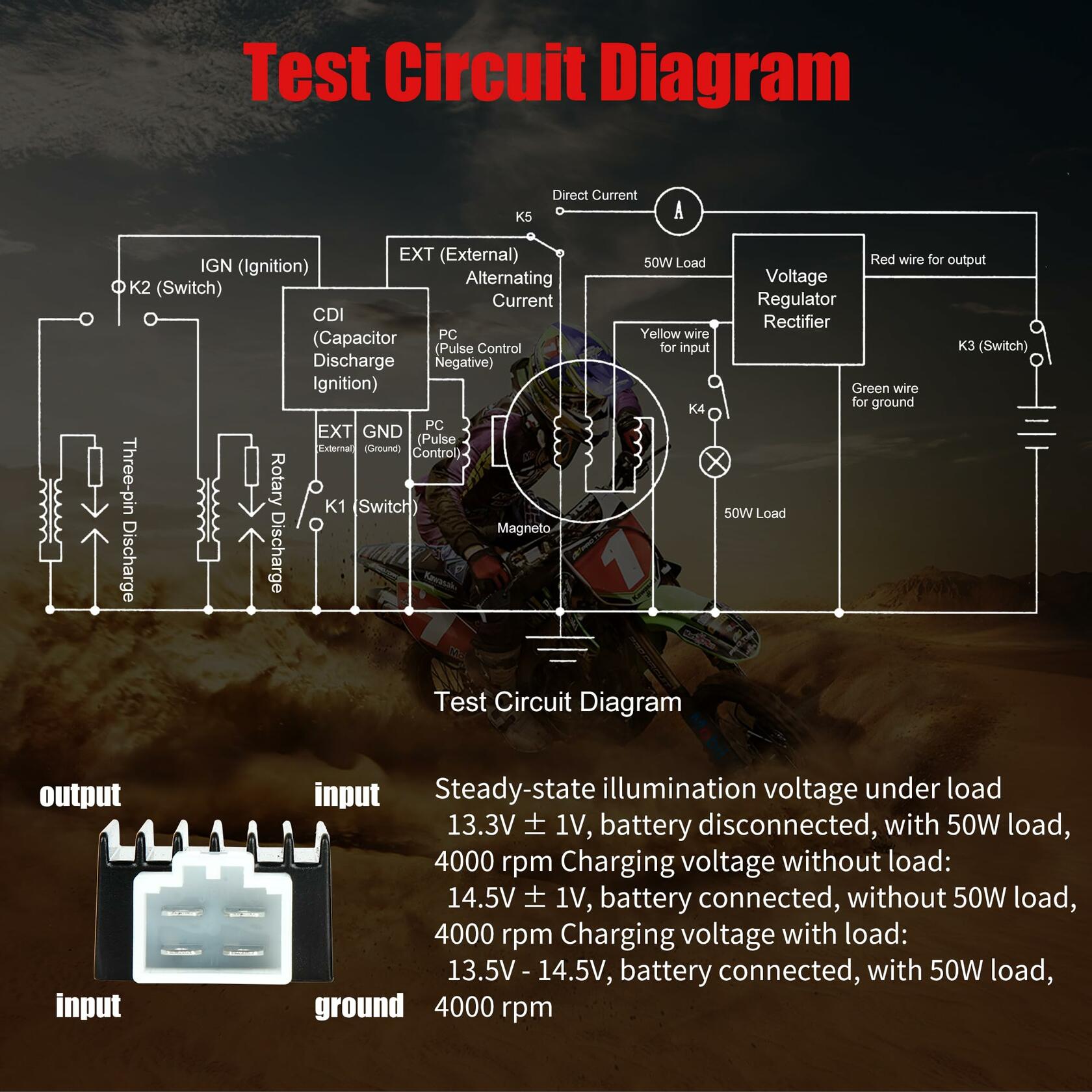 for Tao Tao ATA-110 DATA135 125 Coolster 110CC ATV 3050B 3050B-2 3050C 3050D Roketa Kazuma Meerkat 50cc Falcon 90cc ATV Quad Howhit 150cc Go Kart Wide Compatibility: Suitable for most scooters, mopeds, ATVs, go-karts, buggies, motorcycles, golf carts, and small lawn mowers with single-phase magneto engines (0-50W AC) and GY6 motors (50cc to 120cc). It can also be used on engines up to 150cc or 200cc if the magneto is single-phase HALF WAVE 0-50W. Compatible with brands like SunL, Kazuma, TaoTao, Roketa, JCL, Lance, Baja, Coolster, TGB, TNG, Tank, Redcat, Giovanni, Wildfire, Xtreme, and Seaseng. Superior Materials and Construction: Built with top-quality materials, the Chenxl Half-Wave Regulator operates effectively in temperatures ranging from -30°C to 70°C (-22°F to 158°F). It features a super lightweight design and offers corrosion resistance, excellent thermal conductivity, and durability for years of reliable performance. The regulator uses premium connectors and high-grade aluminum casing, ensuring top-notch performance and durability. It also provides insulating protection, effective sealing, vibration resistance, drop resistance, and is both dustproof and waterproof. The encapsulation is done using advanced potting technology, ensuring superior protection and longevity. Advantages of 12V 4-Pin Half-Wave Dual Silicon Voltage Regulator: High Durability: The use of dual silicon components ensures enhanced durability and longevity, providing a reliable performance over time. Better Efficiency: Dual silicon technology offers improved efficiency and thermal management, leading to better overall performance. Simplicity and Cost-Effectiveness: Half-wave rectification design simplifies the circuit, reducing the number of components and overall cost while providing effective voltage regulation. Lower Heat Generation: The half-wave design results in lower heat dissipation, which helps in maintaining a cooler operation and prolonging the life of the regulator. Improved Power Conversion: Utilizes both halves of the AC cycle more effectively than single-wave rectifiers, ensuring stable and efficient power conversion. Precise Parameters: a. Voltage when the headlight is on and stable: 13.3V ± 1V(4000r/min; K4 closed [headlight on and stable], K3 open [battery not connected]) b. Voltage when the headlight is off: 14.5V ± 1V(4000r/min; K3 closed [battery connected], K4 open [headlight off]) c. When both the headlight and battery are connected:Battery voltage: 14.5V ± 0.5V Headlight voltage: 13.3V ± 0.5V (4000r/min; K3 closed [battery connected], K4 closed [headlight on and stable]) Conforms to: QC/T680-2002 standards. Customer Satisfaction Guarantee: We offer a 100% refund if you are not satisfied. As a direct manufacturer, there are no middlemen, ensuring the best price for you. Our engineers are available 24/7 to assist you. This product is an OEM part originally designed for scooter manufacturers in South America, Southeast Asia, and Africa, specifically for 50-110cc models. Crafted by senior engineers, assembled using high-speed placement machines, welded on a Yamaha high-temperature intelligent production line, and inspected with high-resolution optical AOI instruments, we guarantee its quality.