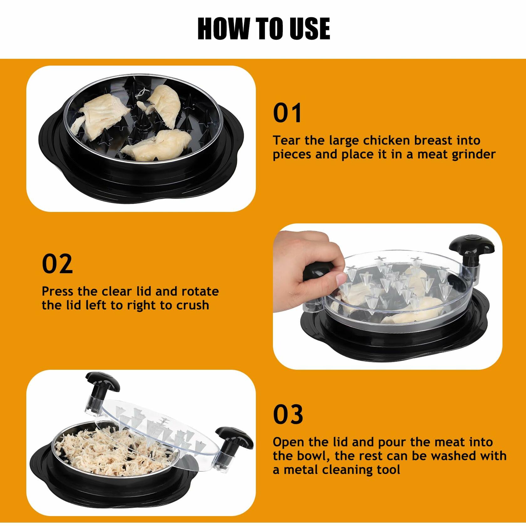 - How to Use :Install the rotating handle; Place the cooked chicken breast or meat on spkies,close the lid and rotating handle and twist on one direction util the chicken meat shredded . Great kitchen gadgets for you ,Especially good for people who like to gyms, eat light or make food for kids or pets。 Importante Note: MEAT MUST BE COOKED BEFORE SHREDDING