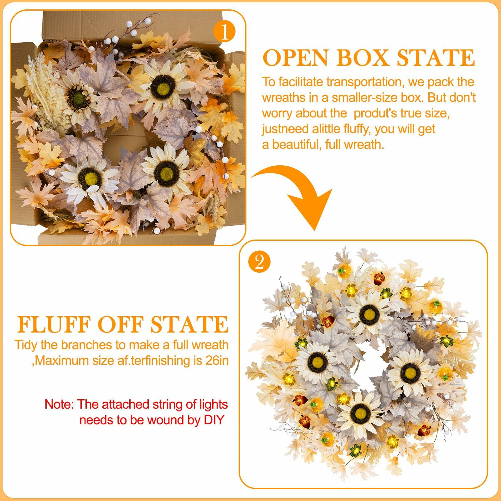 - [26 wreath for fall Decor Warm Tips]:To prevent the outdoor fall wreath with lights from being damaged during transportation, the wreath decoration is tightened. You can adjust as needed to get the best look.