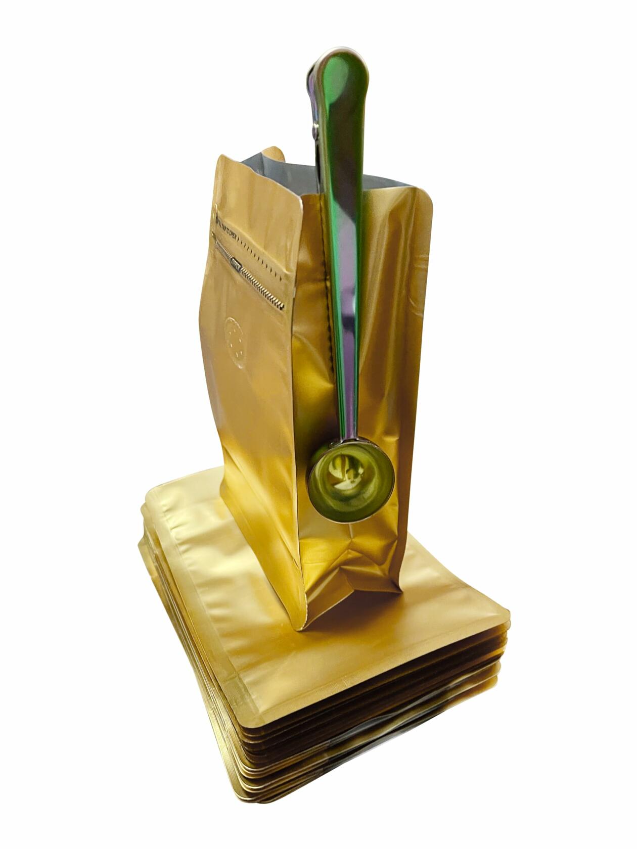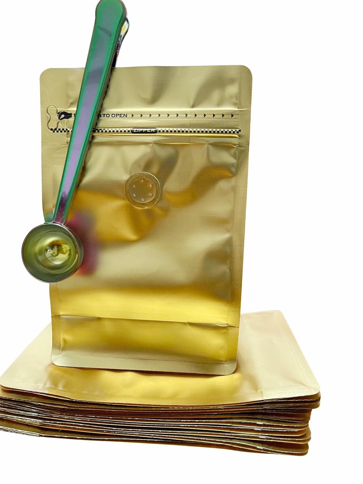 Gold Coffee and Tea Bags-( 250gm/8oz/1/2lb) and Coffee Scoop Clip - Measuring Spoon Clip (Rainbow) color Uses for household: Not only to ensure that the coffee is fresh, but also to store snacks, tea and fruits and nuts. for commercial uses: You can paste your brand label on the surface as a retail or sample display package. Food Safe Foil Material- Preserve the flavor and freshness of your coffee and tea products when you store them in the packaging. The food-safe material will ensure that the beans and loose tea leaves stay flavorful and clean. Durable Bottom Gusset- The bottom of these pouches features an expandable bottom gusset. This gusset will unfold as contents are added to the bag. This increases the internal capacity. It also allows the bags to stand on flat surfaces like shelves, counters or tables They can also be used as gift bags for Friends and family.