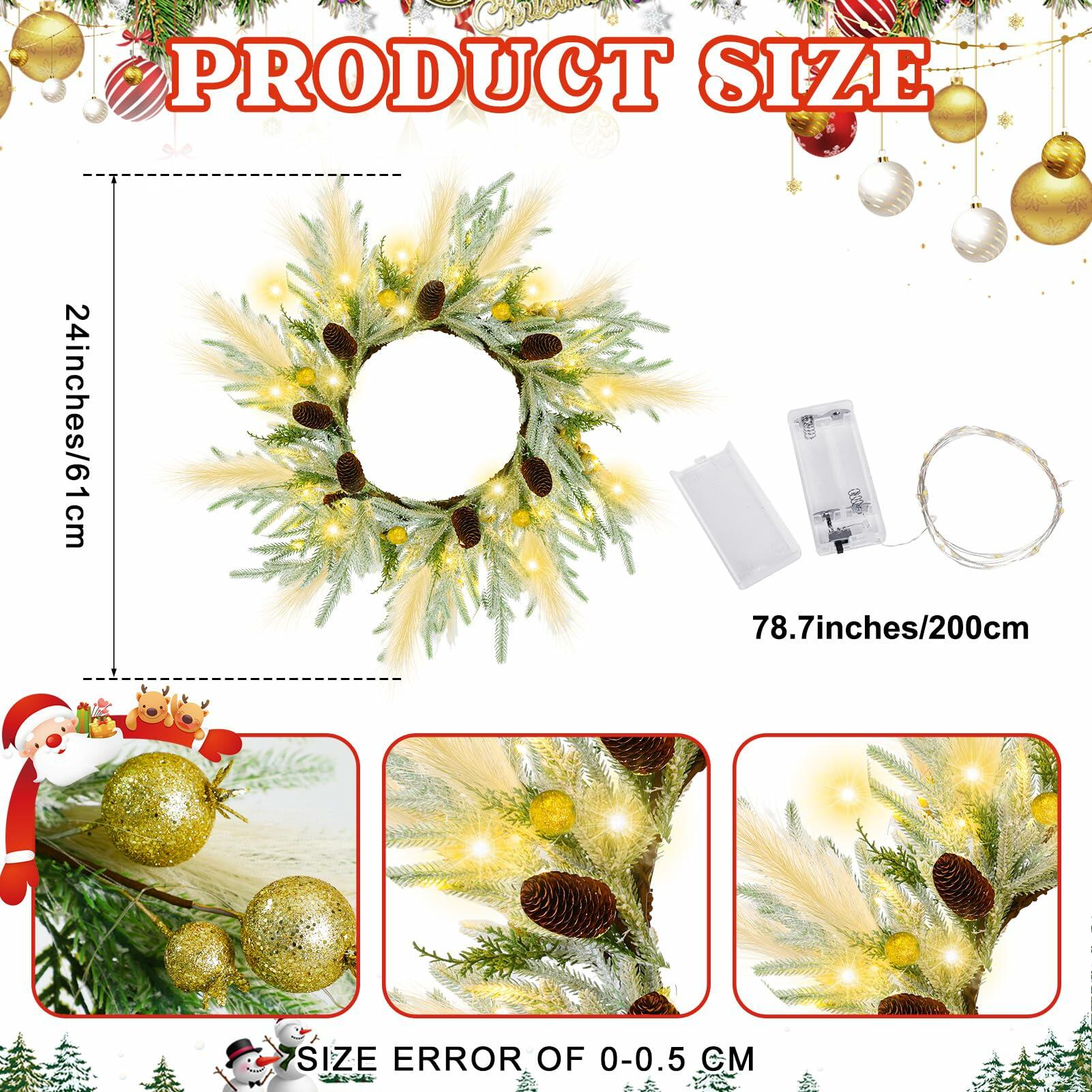 - Norfolk Pine and Pampas Wreath Set: you will receive 1 piece of 24-inch pre-lit PE wreath and 1 piece of warm white LED lights(Batteries not included, you need to prepare two AA batteries); The pine and pampas flocked grass wreath can certainly meet your Christmas decorative needs, which can match the festive atmosphere well