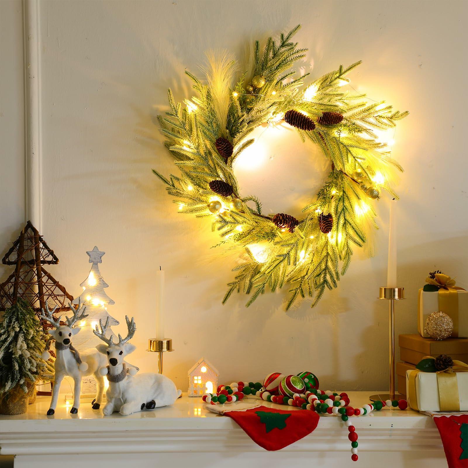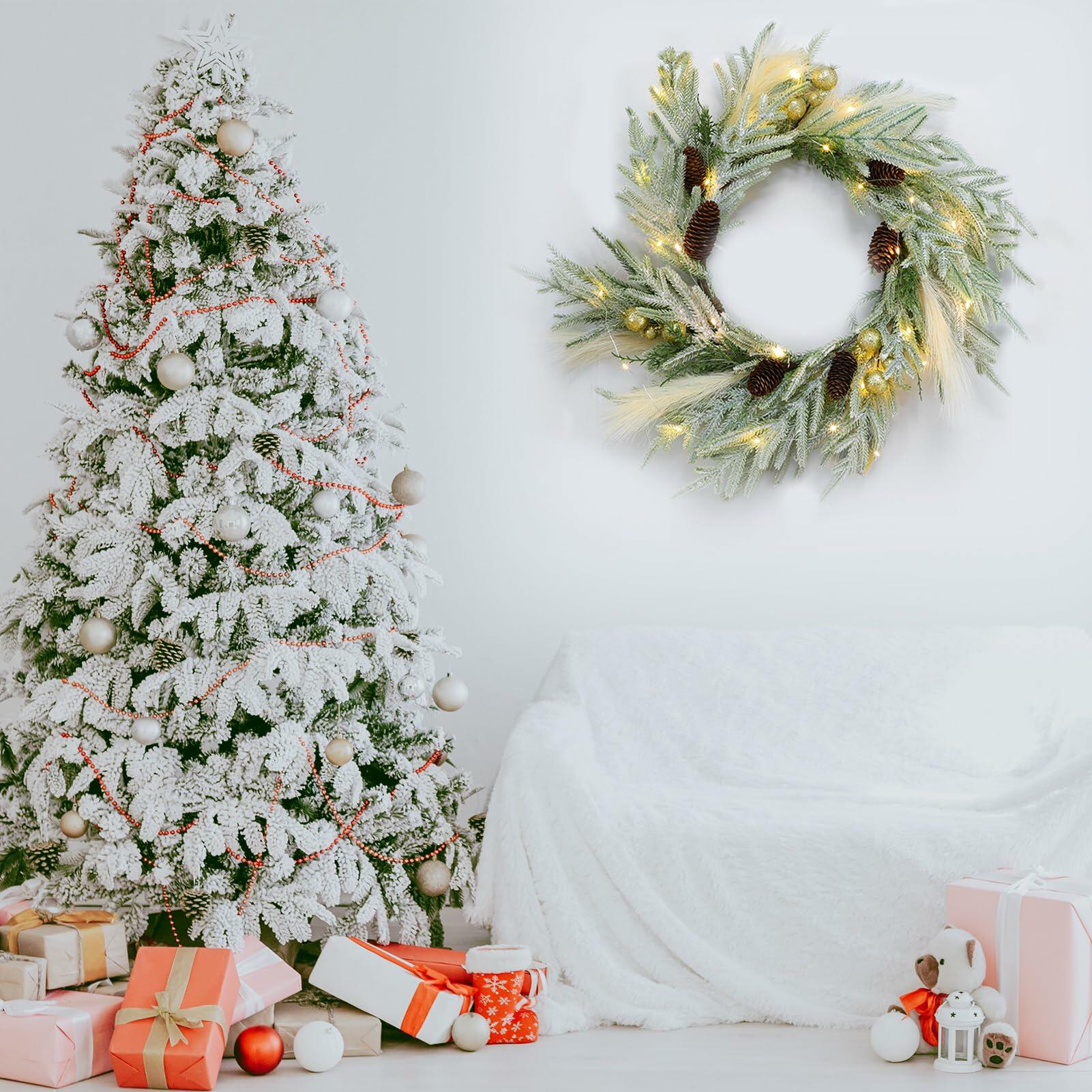 - Seasonal Decor Accent: the artificial flocked Christmas wreath features pines and grass, with pine cones and golden balls, and white flocking is made to imitate the look of freshly fallen snow, the 2-meter light string with 20 warm white LED lights; Display this wreath off of a door or wall for a charming Christmas theme, it is the nice touch for your door or wall during the holidays