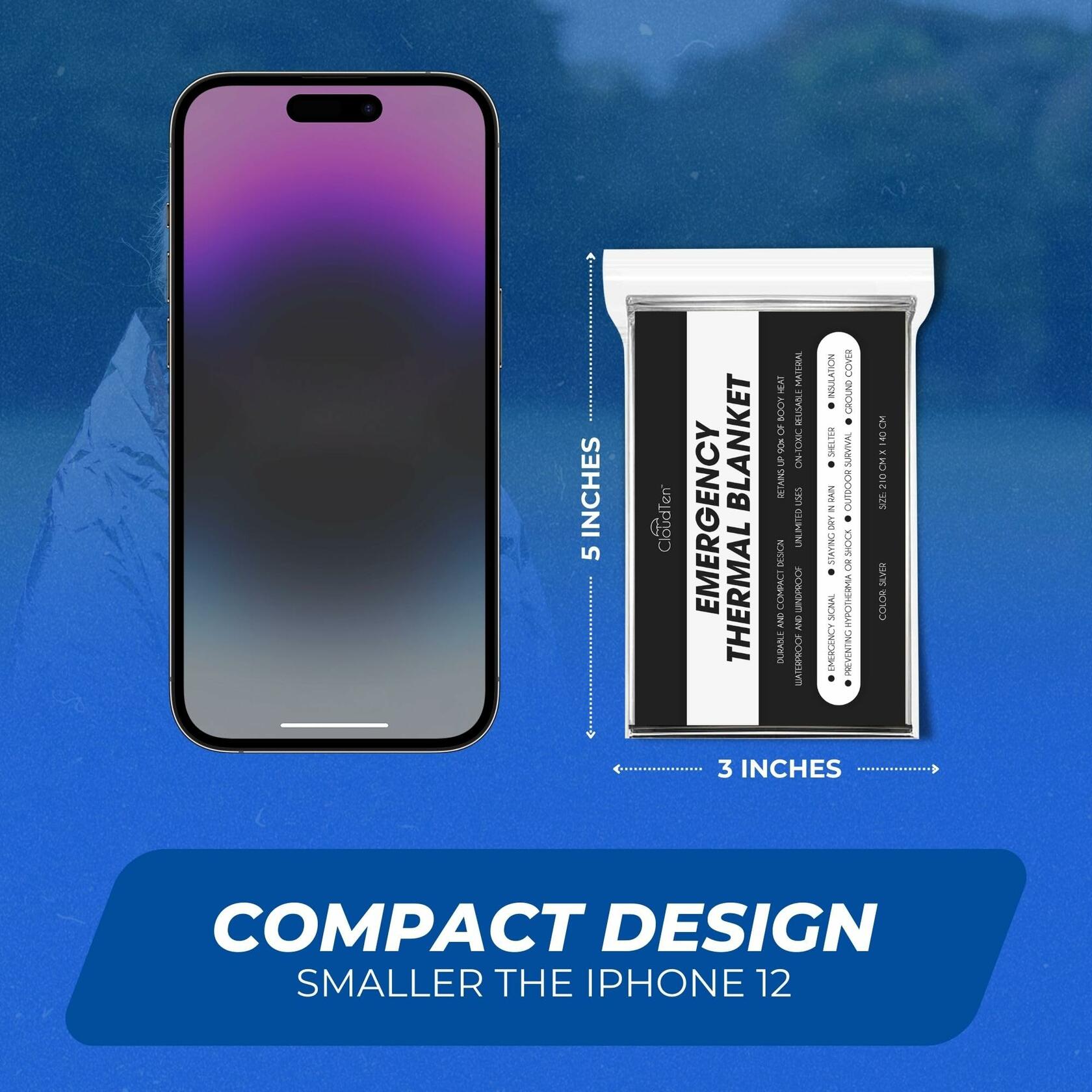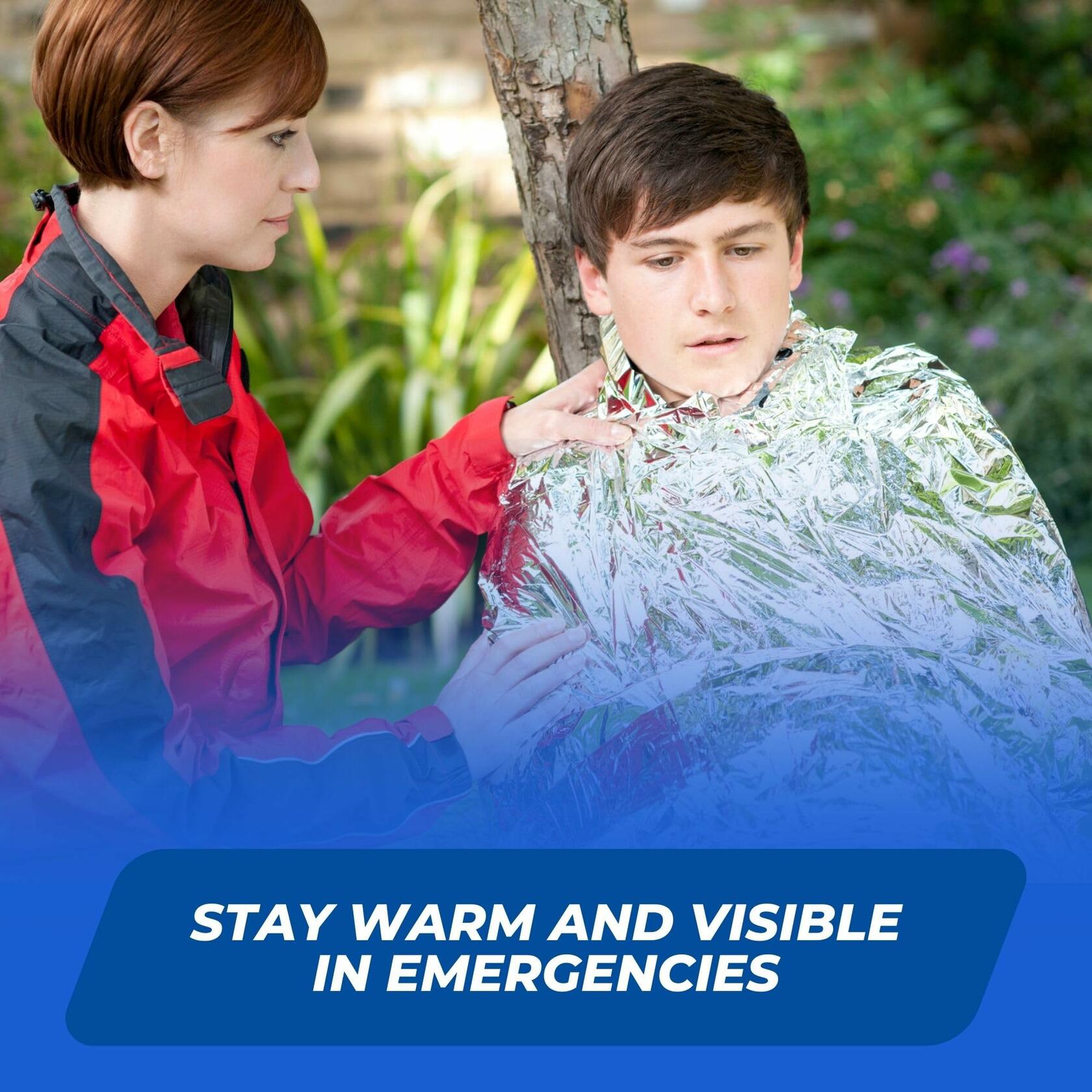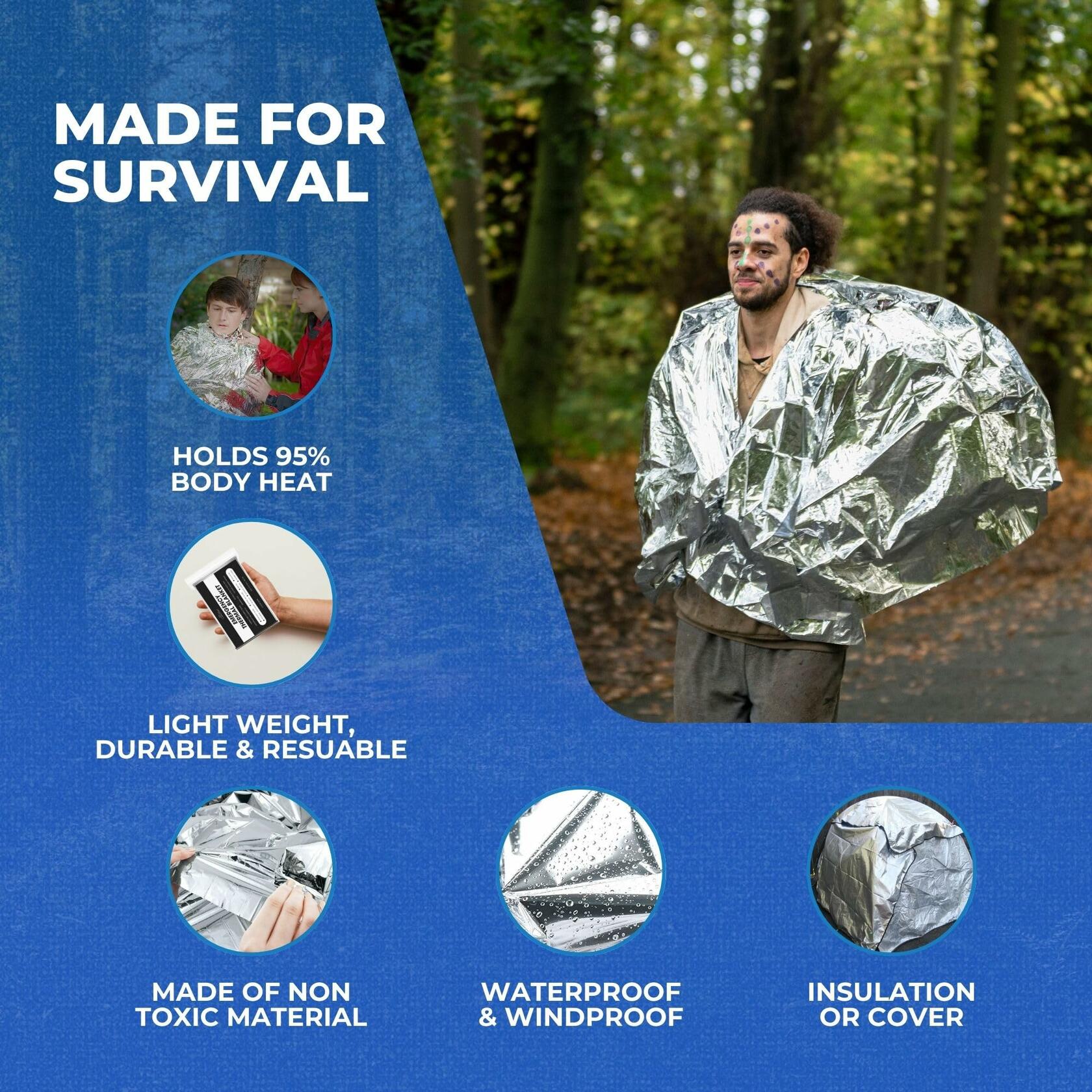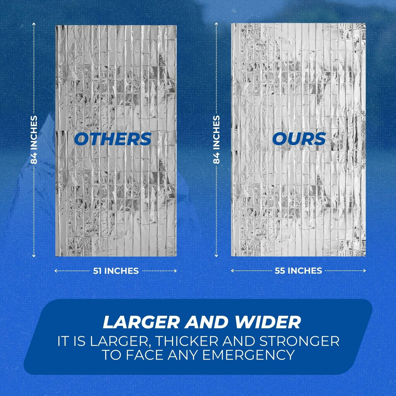 - EXTRA LARGE YET COMPACT: Our emergency blankets for survival measure a generous 84" x 55", ensuring superior coverage and protection in emergency situations. Unlike standard sizes, these larger camping blankets provide enhanced warmth and shelter. Each thermal blanket is compactly packed making it the perfect emergency travel blanket that fits in your bugout bag, emergency backpack or even your pockets.