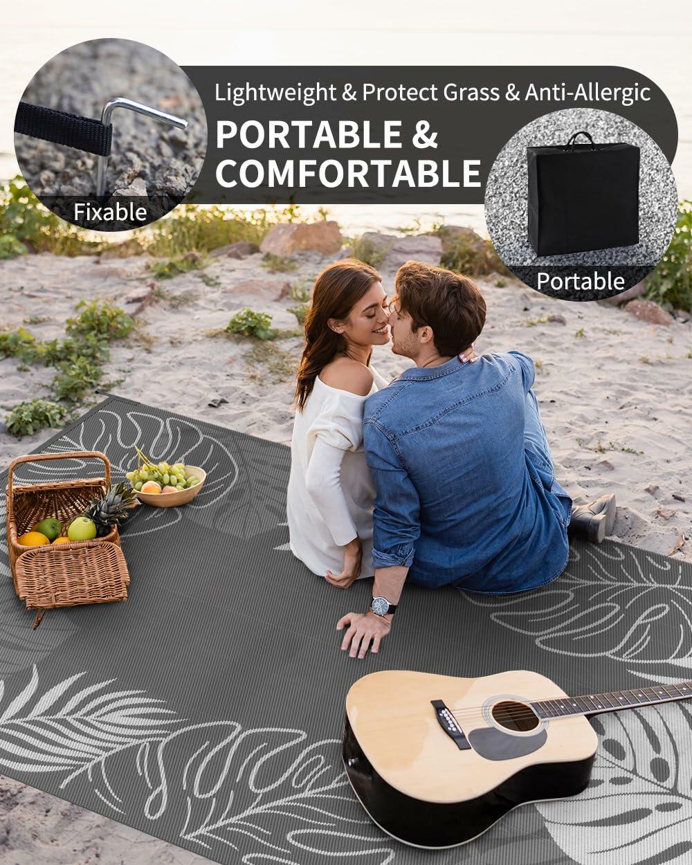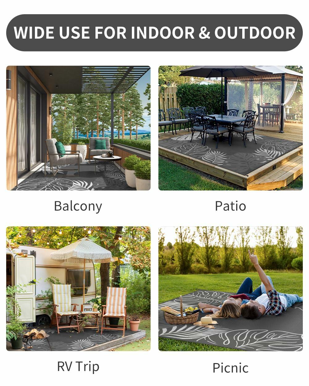 - RV traval&Camping: This camper must haves outdoor rug is ideal for picnics, gatherings, and RV trips! The lightweight outdoor camping carpet with foldable lines is easy to carry and saves space. Includes an extra carry bag and rug stakes for 6x9 ft, 8x10 ft and 9x12 ft. Grass-friendly, durable, and easy to clean, this outdoor rug enhances outdoor adventures.
