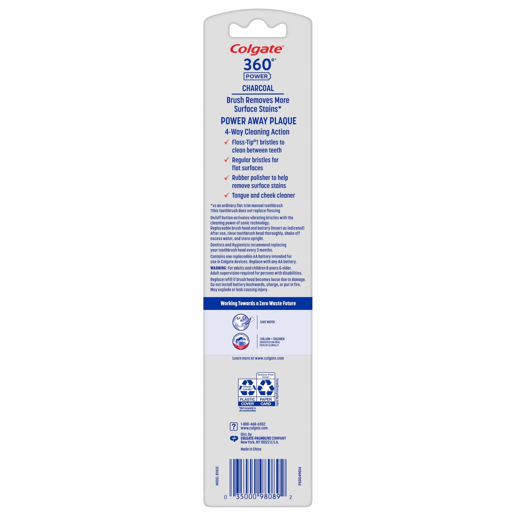 - Includes one Colgate 360 Power Charcoal Battery Toothbrush, 1 AA battery included