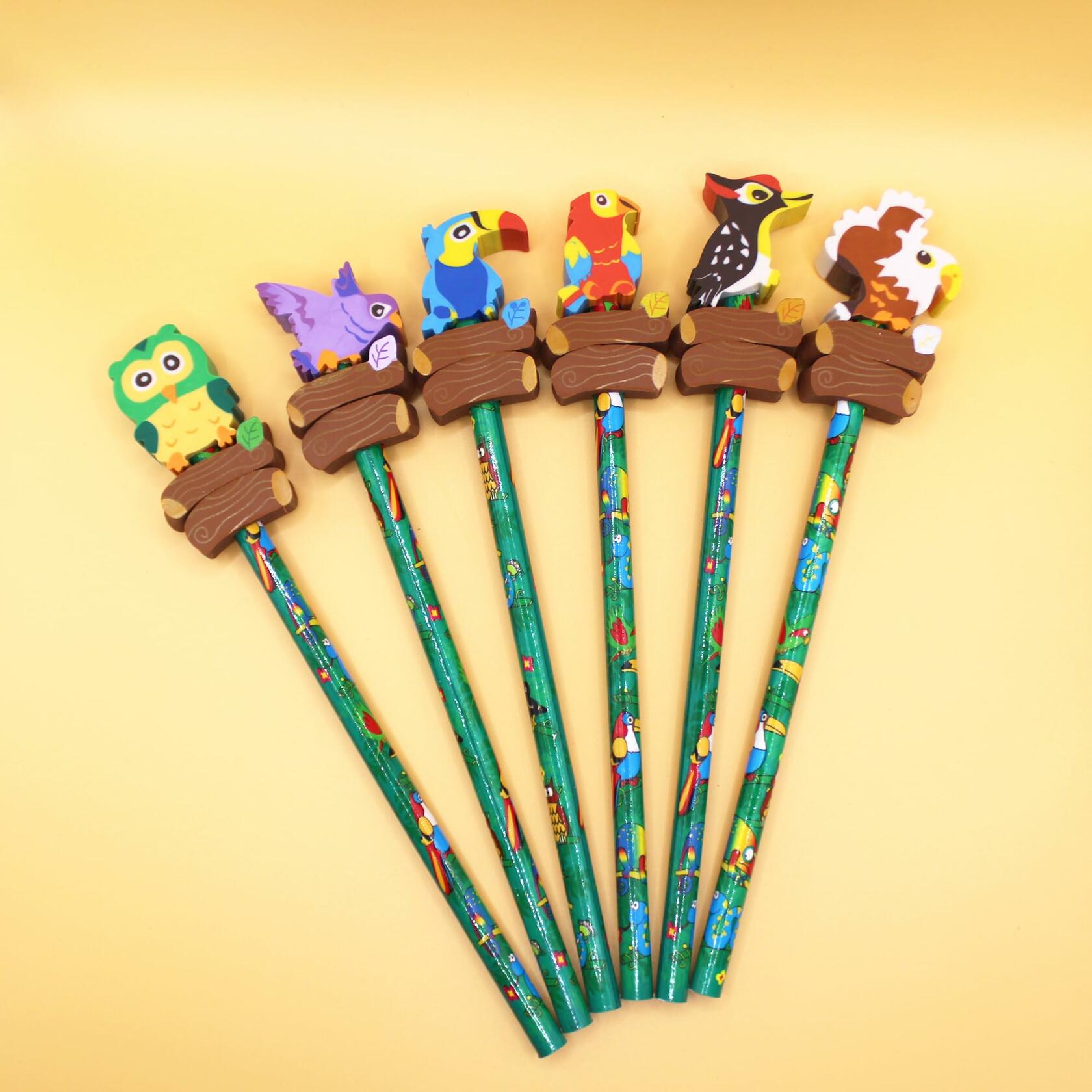 Add a touch of nature to your child's school supplies with these bird-themed pencils and erasers. Each pencil features vibrant designs of colorful birds, from owls to woodpeckers, with matching bird-shaped erasers perched on top. Perfect for sparking creativity, these pencils make writing and drawing more fun while providing a practical, smooth writing experience. The durable erasers are not only cute but also effective for quick corrections. These bird-themed pencils are ideal for school, party favors, or as a unique gift for young nature lovers.FEATURES
