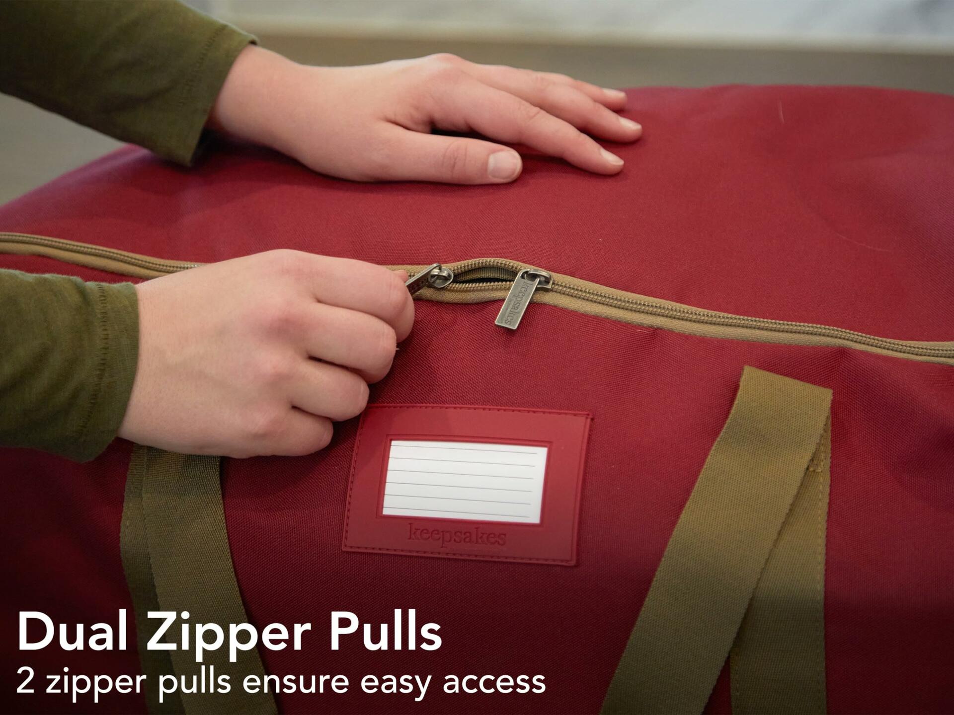 - Heavy-Duty Christmas Tree Bag - Crafted for strength and durability, this thick polyester bag resists punctures and tears from branches. Reinforced carrying handles allow for easy transport, while a heavy-duty D-ring offers convenient upright storage.