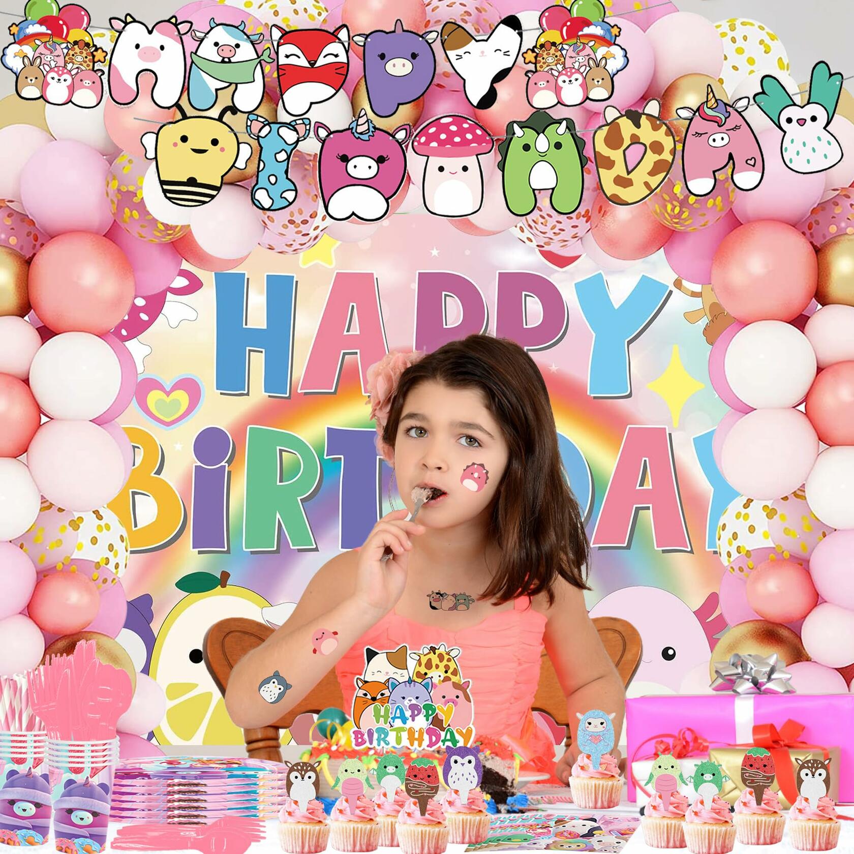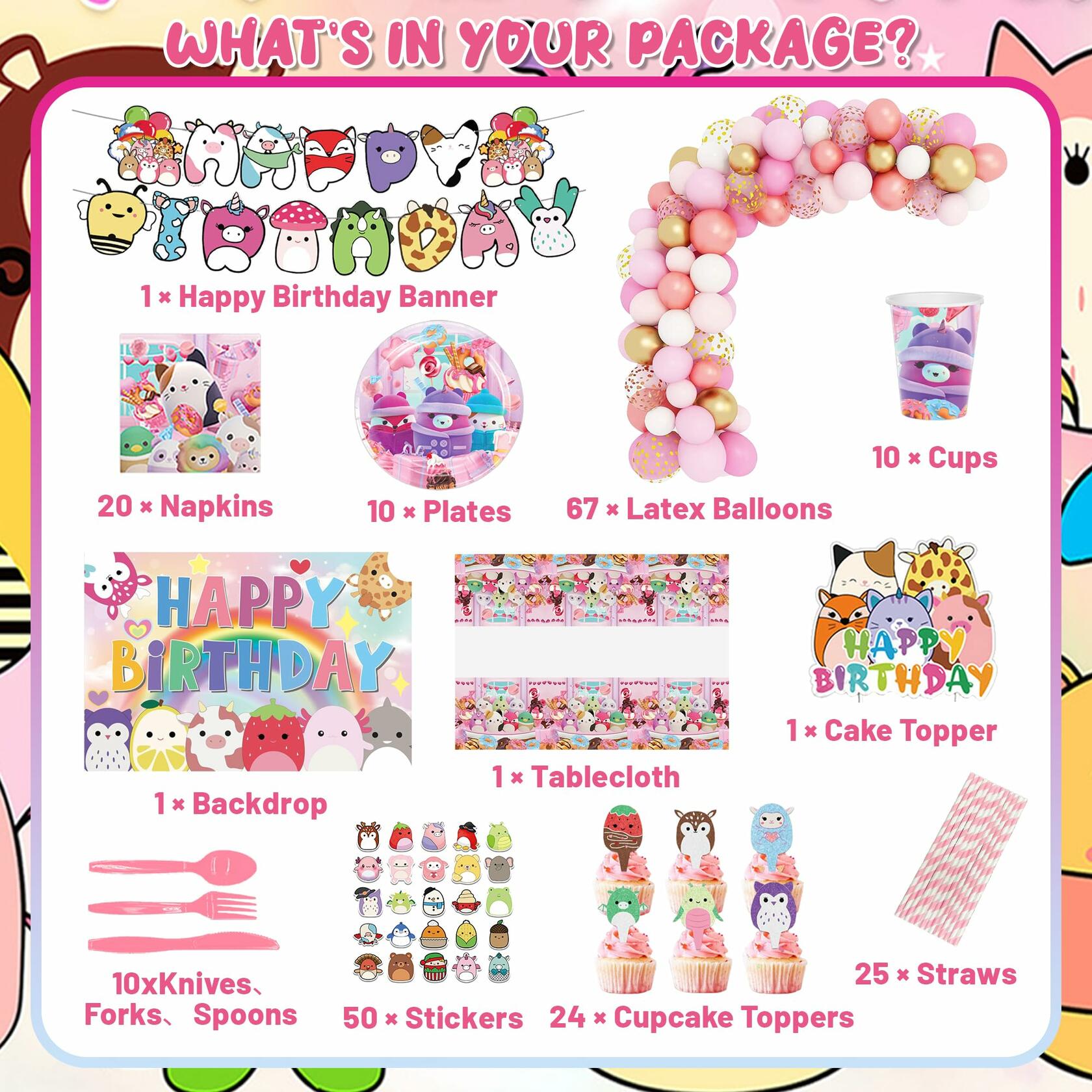 - [250 PCS Party Decorations]: This pink party decoration kit includes 1 happy birthday banner, 1 cake topper, 24 cupcake toppers, 1 backdrop, 1 tablecloth, 67 latex balloons, 10 forks, 10 spoons, 10 knives, 10 7-inch plates, 10 cups, 20 napkins, 25 paper straws and 60 stickers, serving 10 customers.