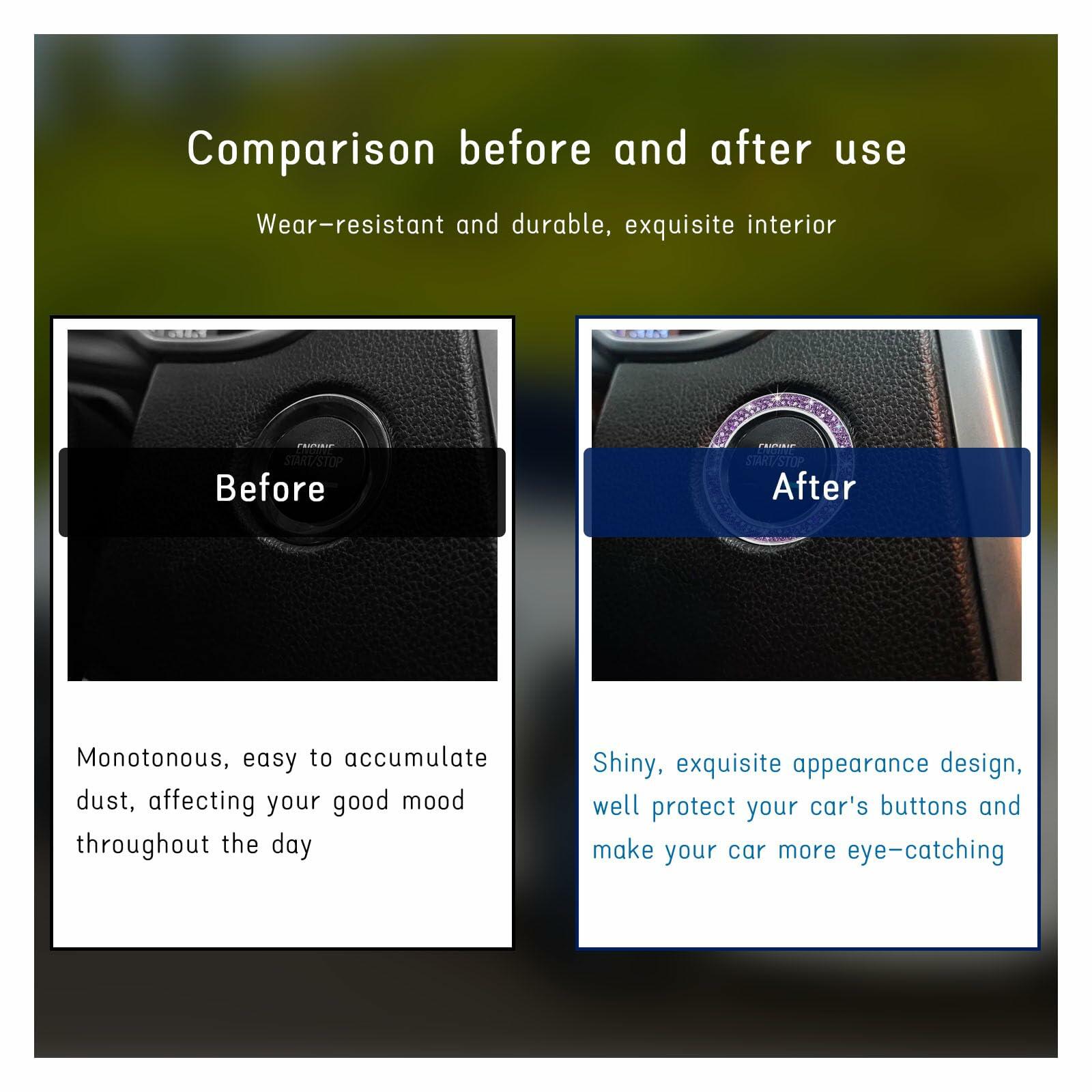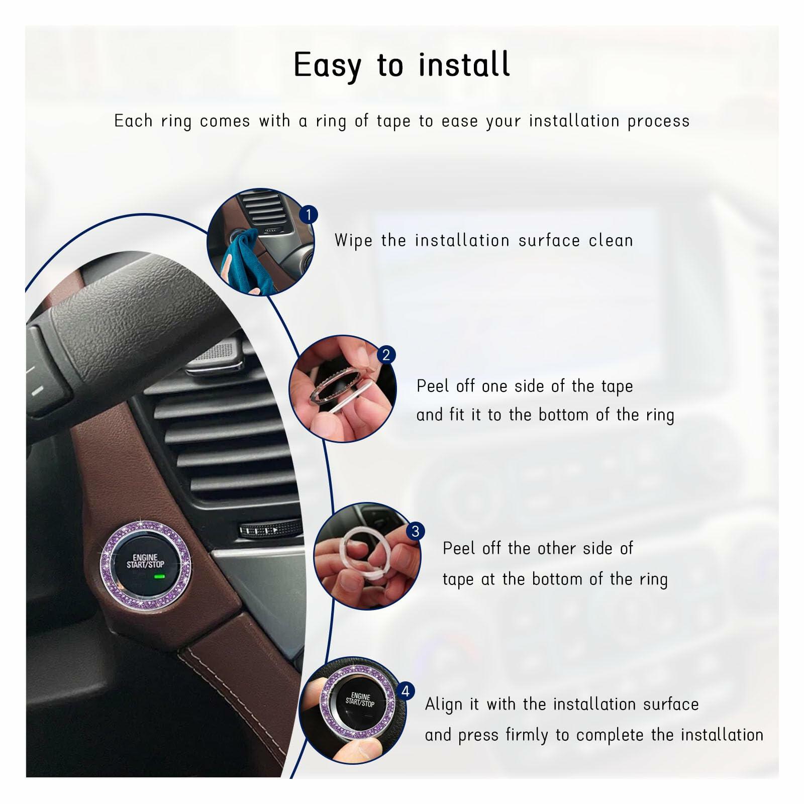- 【Easy Installation】: Each crystal ring comes with a loop of tape, no other tools are needed. Start by cleaning the mounting location, peel off one of the sheets of tape, align it with the bottom of the ring and press firmly. Finally, peel off the film on the other side of the tape, align it with the ignition button, and press firmly so that it sticks tightly to the button.