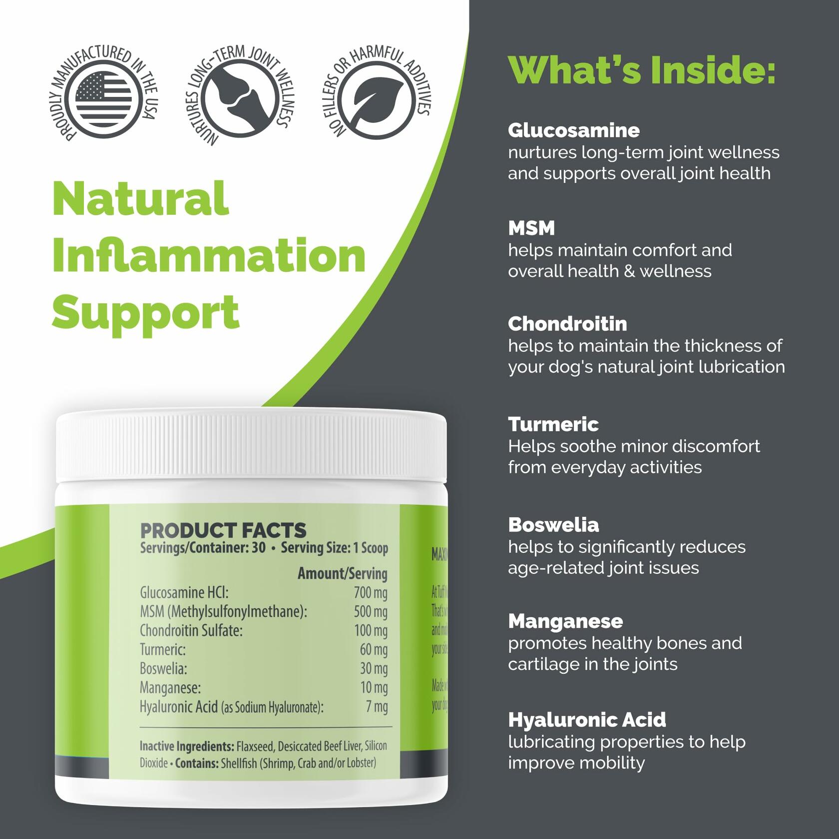 - ENDLESS ENERGY FOR PLAYFUL ROMPS: Imagine a life where your dog is always ready for the next adventure. Tuff Mutt's Dog Joint Support Supplement is designed to support overall vitality, helping keep your dog active for long walks and playtime. Made with glucosamine chondroitin, this hip and joint supplement powder is crafted to help your pup feel their best, turning everyday moments into joyful memories.