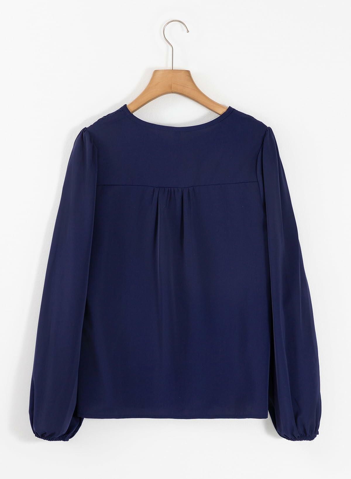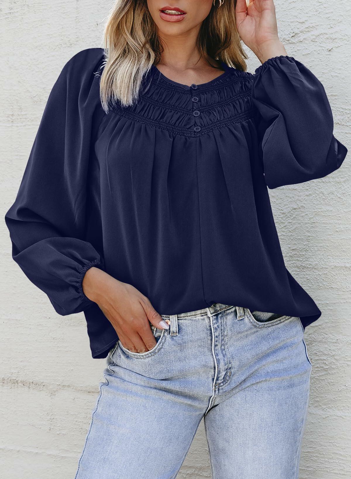 Dokotoo Fall Clothes Women Round Neck Smocked Top Navy Blue Size L