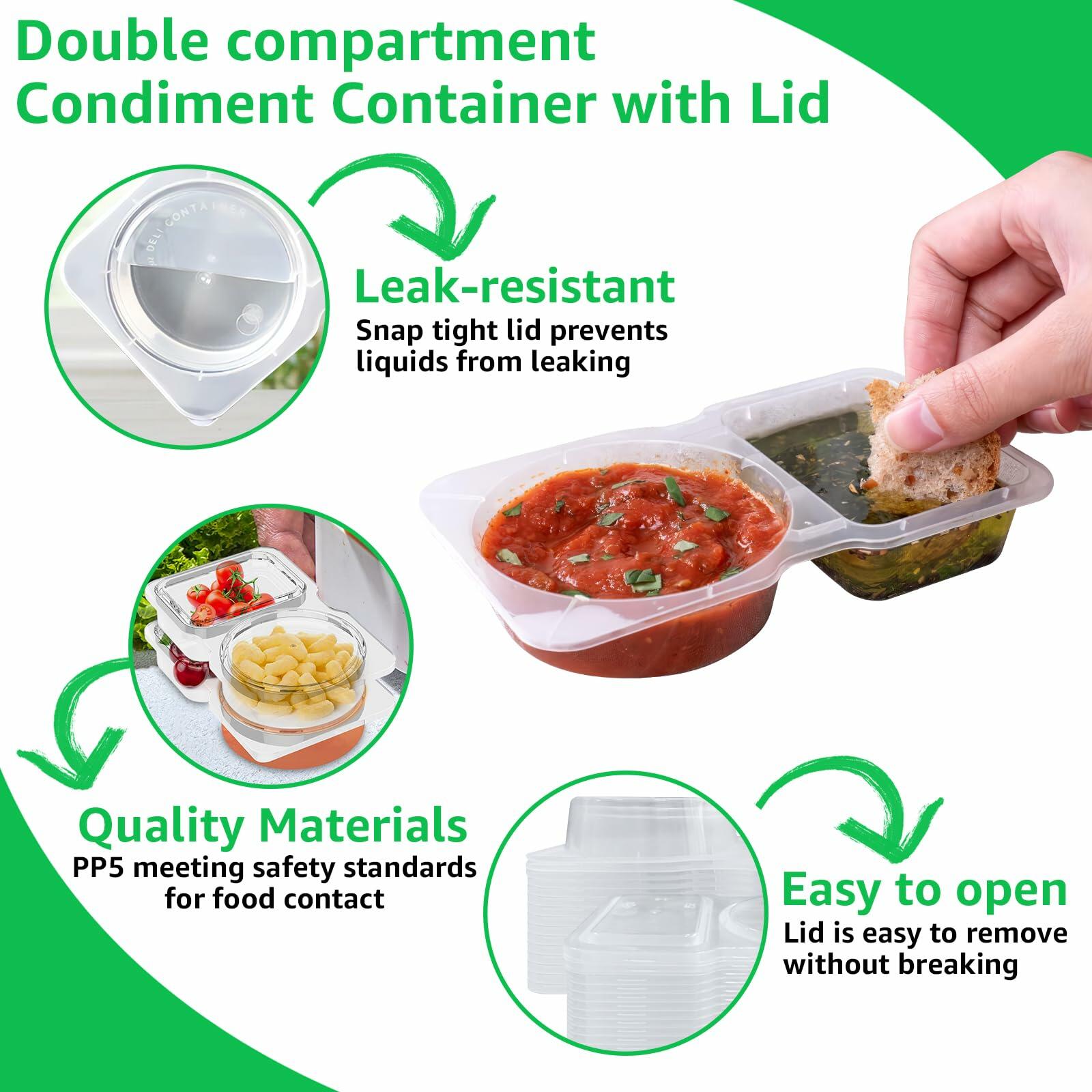 - [Versatile Packaging] - Double Compartment Condiment Containers with Lids. Perfect for restaurants, food trucks, delivery services, special events, and leftovers, these containers provide exceptional convenience and functionality.