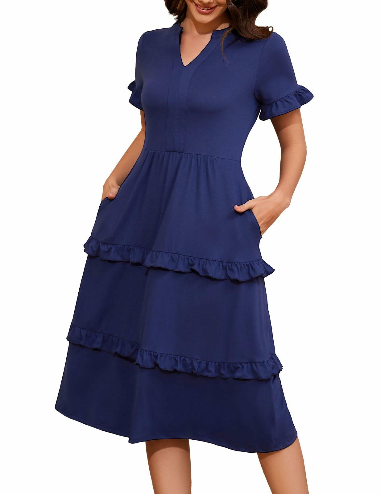 - Romantic Design Details: This casual midi dress features a chic V-neckline, delicate short ruffled sleeves, two handy side pockets, and cascading tiered skirt for a dreamy, movement-rich look that catches the light.