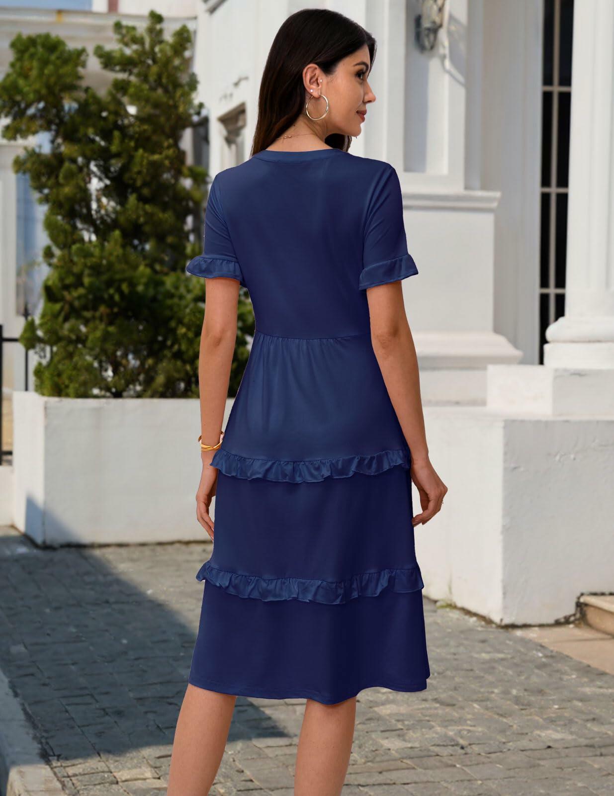Embrace Effortless Elegance Step into the spotlight with our Solid Color Midi Casual Dress, where comfort meets high-fashion design. Crafted for the modern woman who thrives at social gatherings, this summer beach dress blends romantic details with practical luxury. Why Youll Love It: Dance-Ready Comfort: The stretchy fabric moves with you, while the breezy midi length and relaxed fit ensure all-night comfort. No more tugging or adjusting! Head-Turning Details: The flattering V-neck elongates your silhouette, paired with whimsical ruffled sleeves and a cascading tiered skirt that sways with every step. Multi-Occasion Magic: From rooftop cocktails to wedding after-parties, this flowy sundress transitions seamlessly. Layer with a blazer for office events or add statement jewelry for nightclub glam. Hassle-Free Care: Toss it in the washing machine it retains shape and color wash after wash, saving you time and dry-cleaning costs.