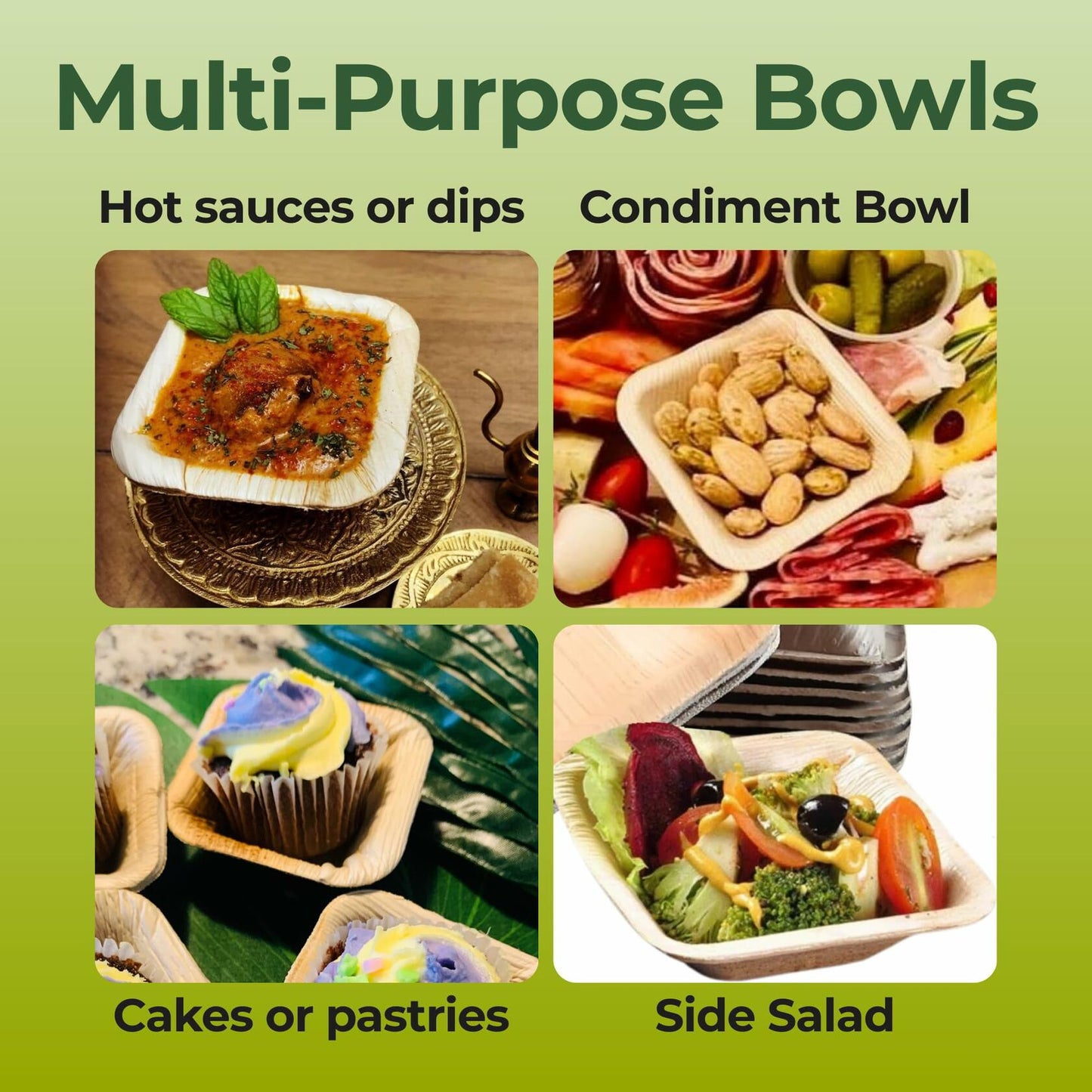- Sturdy, Leaf proof & Grease Resistant Multipurpose Bowls: Made from centre portion of palm leaves, these disposable natural decorative bowls are very sturdy and used as tasting bowls, salad sauce bowls, condiment bowls, charcuterie board accessories for serving sauces etc. at weddings, camping, BBQ, luau, Dinners, food trucks, restaurants, thanks giving, Christmas, porch party or as beach dinnerware.