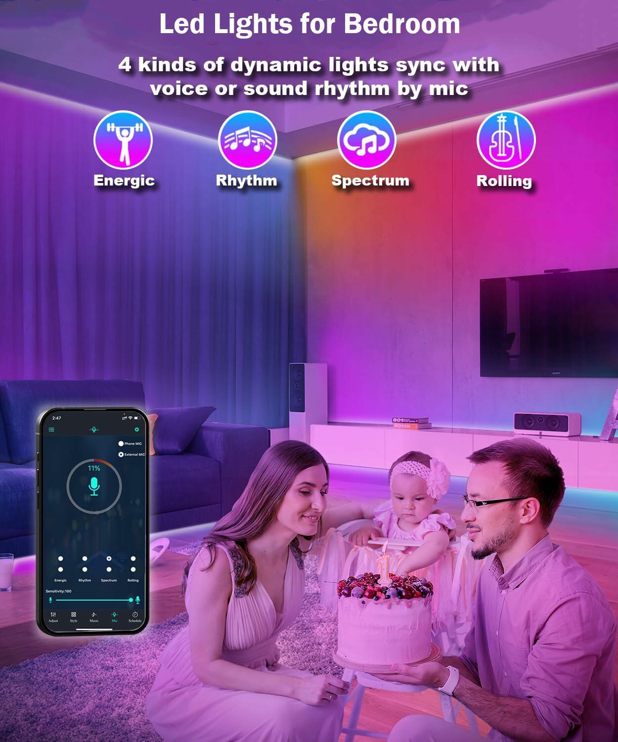 - Dynamic Mic Modes:With built-in mic,the led strip lights will change colors and dance to the rhythm of music or surrounding sounds,bring you a More cheerful and dynamic lighting experience.When you are watching movie, dancing, having party, or playing games, just choose Mic mode.There is also style mode which 200+ flickering light ambience brings you a more calm and pleasant mood, a good choice for your room decor, right?