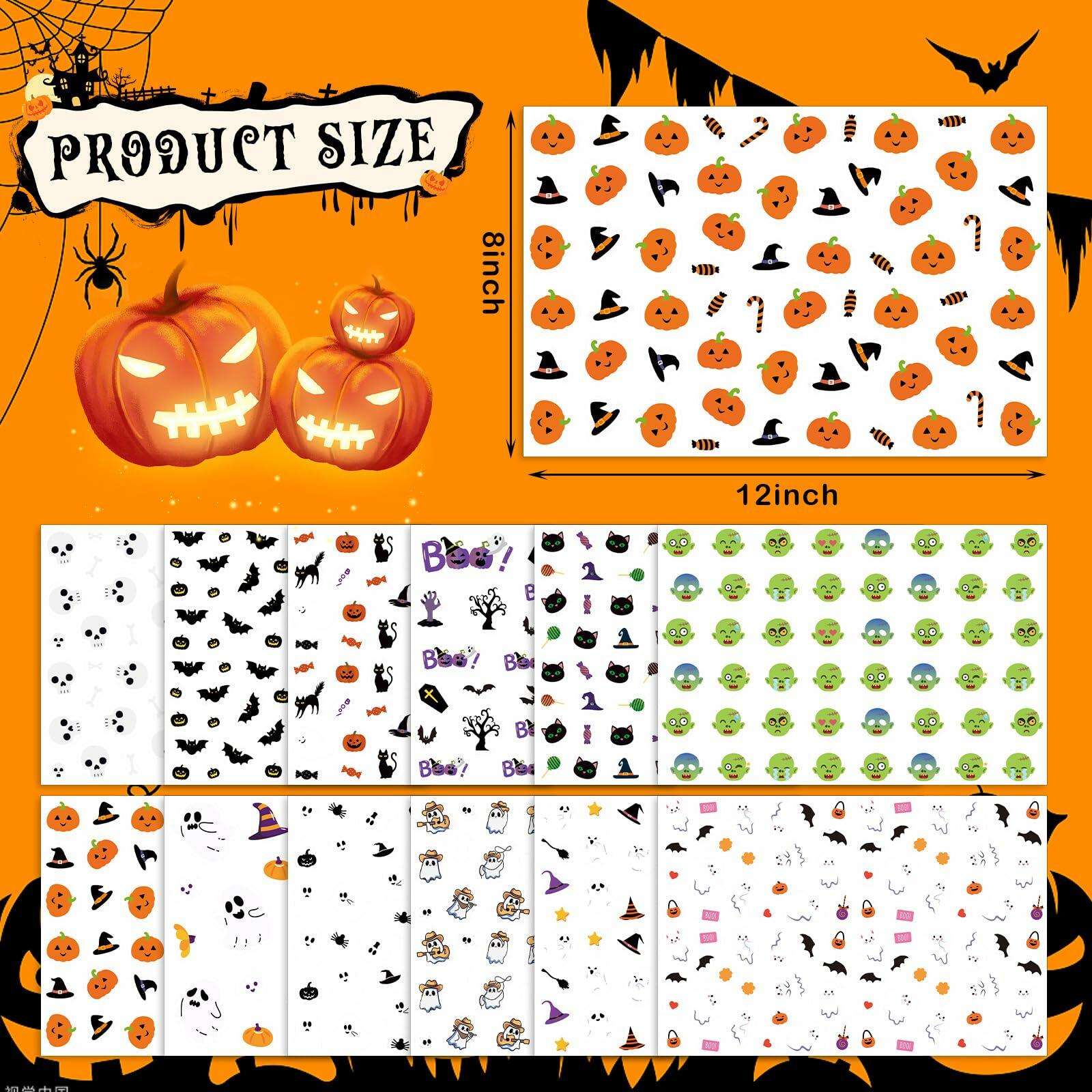 - Classic Halloween Designs: the Halloween sticker set includes 12 large sheets sticker (12 x 8 inches) featuring a wide range of Halloween-themed elements like ghosts, bats, zombies, and skulls; Brightly printed on glossy coated paper, each sticker brings your pumpkin to life with vivid, spooky expression