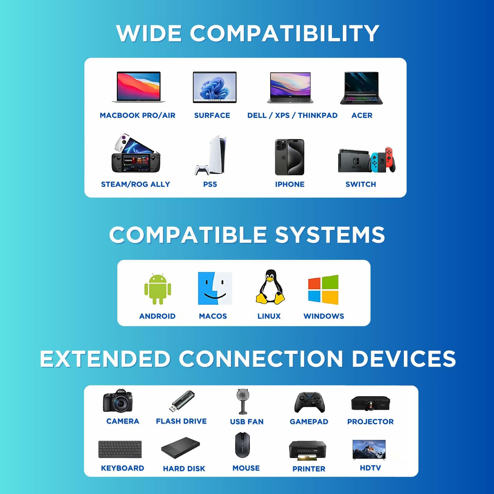Compatible with a wide range of USB-C devices, this hub supports laptops, tablets, and phones, ensuring seamless connectivity for all your devices. Its 100W Power Delivery (PD) charging capability keeps your devices powered while you work or play, eliminating the need for multiple chargers. This feature is especially useful for users who need to charge their devices quickly without sacrificing data transfer speeds.