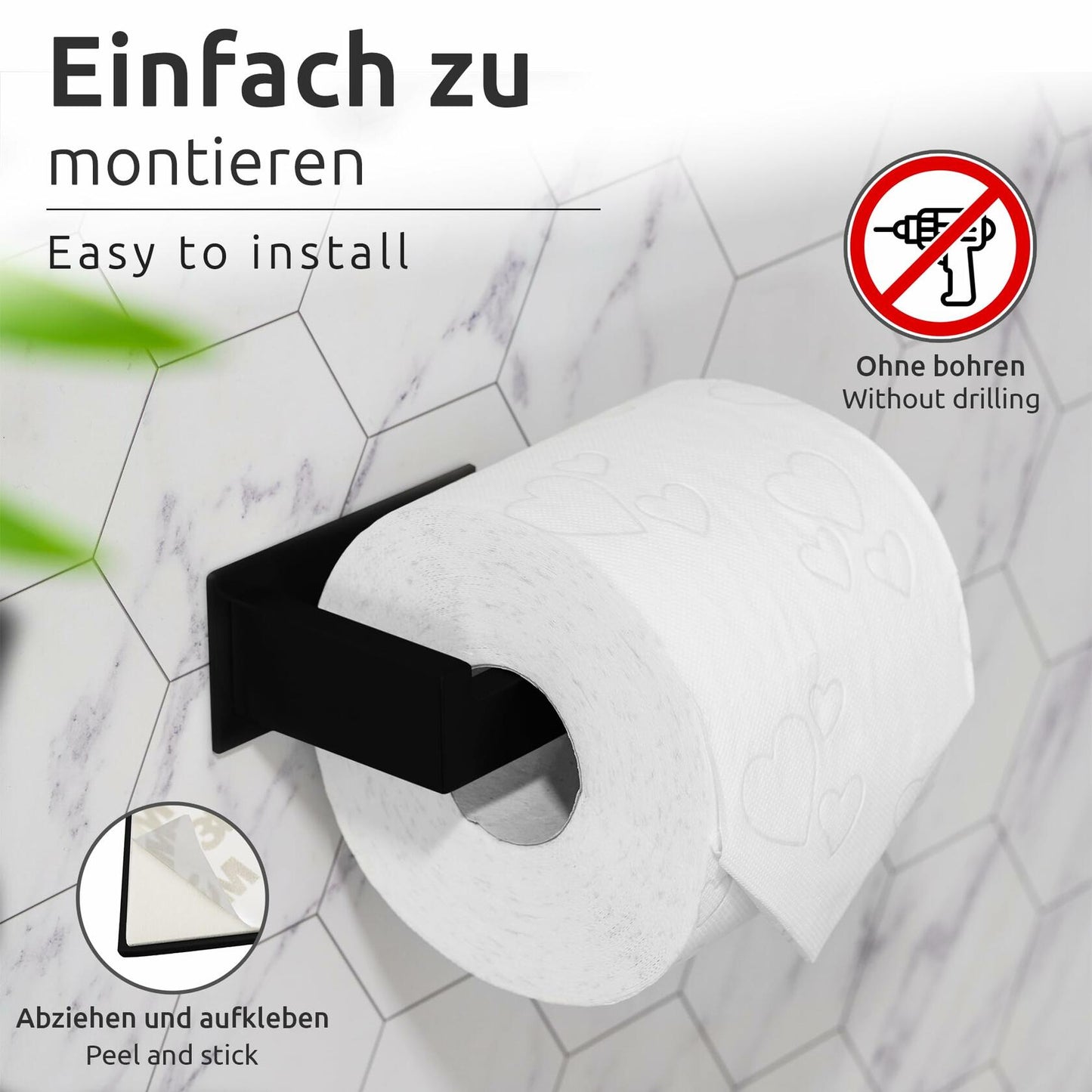 ECENCE Bathroom Hardware Set 1 Toilet Roll Holder + 2x Towel Hooks self-adhesive without drilling black Stainless steel 304 Towel bar Set Bathroom Accessories- Our set, consisting of 2 towel hooks and a toilet paper holder, impresses with its simple and high-quality design. Made of rust-free stainless steel 304, these accessories are perfect for bathrooms and wet areas as they do not rust. The self-adhesive technology allows for easy, drill-free installation while ensuring a firm and stable attachment to the wall. The necessary mounting material is included.These hooks have versatile uses- In the hallway as a key rack or for hanging jackets and bags. They are also practical in the kitchen, for example, for storing kitchen towels. The toilet paper holder fits harmoniously in any bathroom, toilet, or guest bathroom and is even perfect for use as a workshop paper holder. This provides versatile solutions for your needs without unnecessary drilling into your tiles.Advantages & Features- Sturdy wall hooks and toilet paper holder made of rust-free stainless steel 304- High-quality angular design- Stable installation thanks to 3M adhesive pad- Easy installation: Mounting material is included- Durable and resilient- Universal applicationWith this high-quality bathroom accessory, you can stylishly upgrade your bathroom and benefit from practical functionality.Scope of supply- Bathroom set 1x self-adhesive toilet paper holder + 2x towel hooks Black#