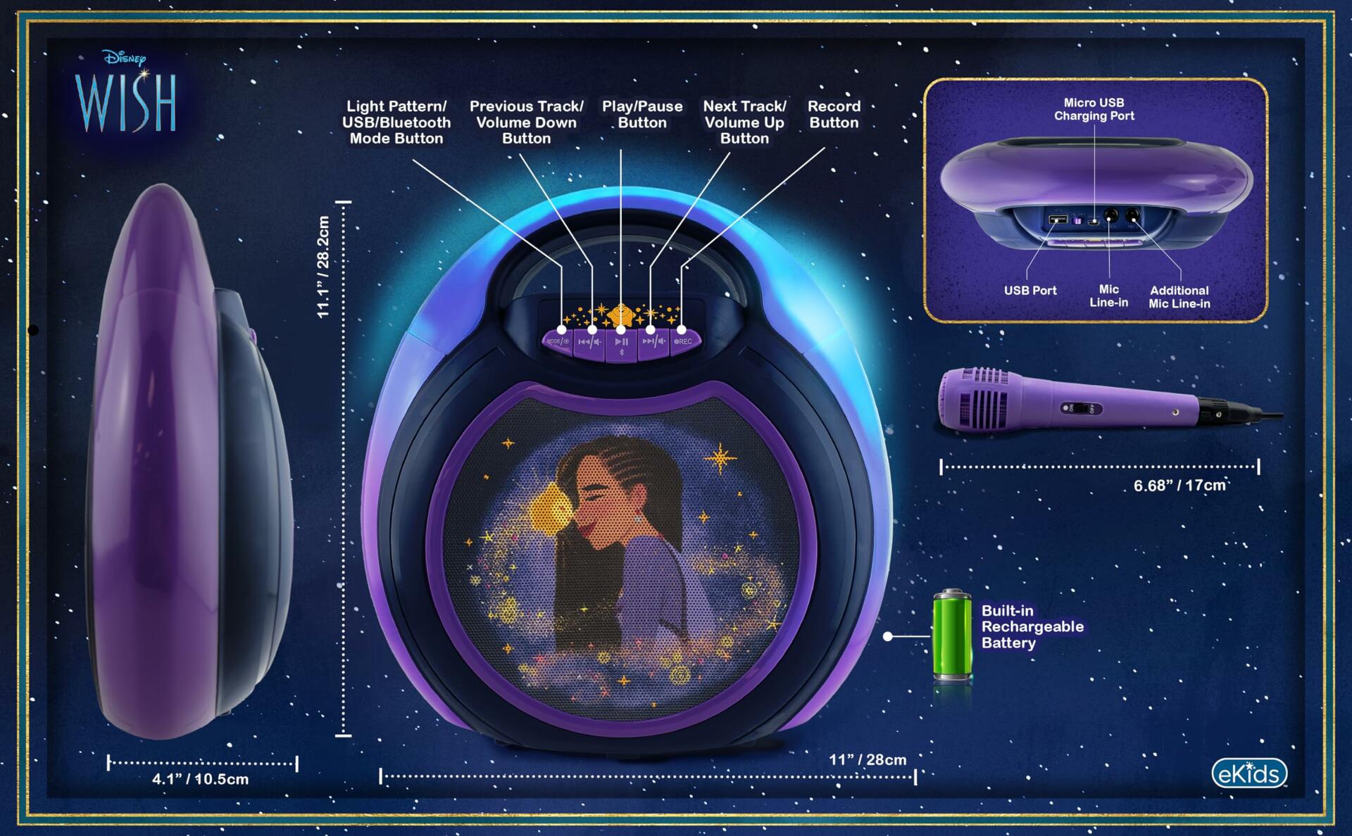 eKids Disney Wish Karaoke Machine Bluetooth Speaker with Mic for Kids