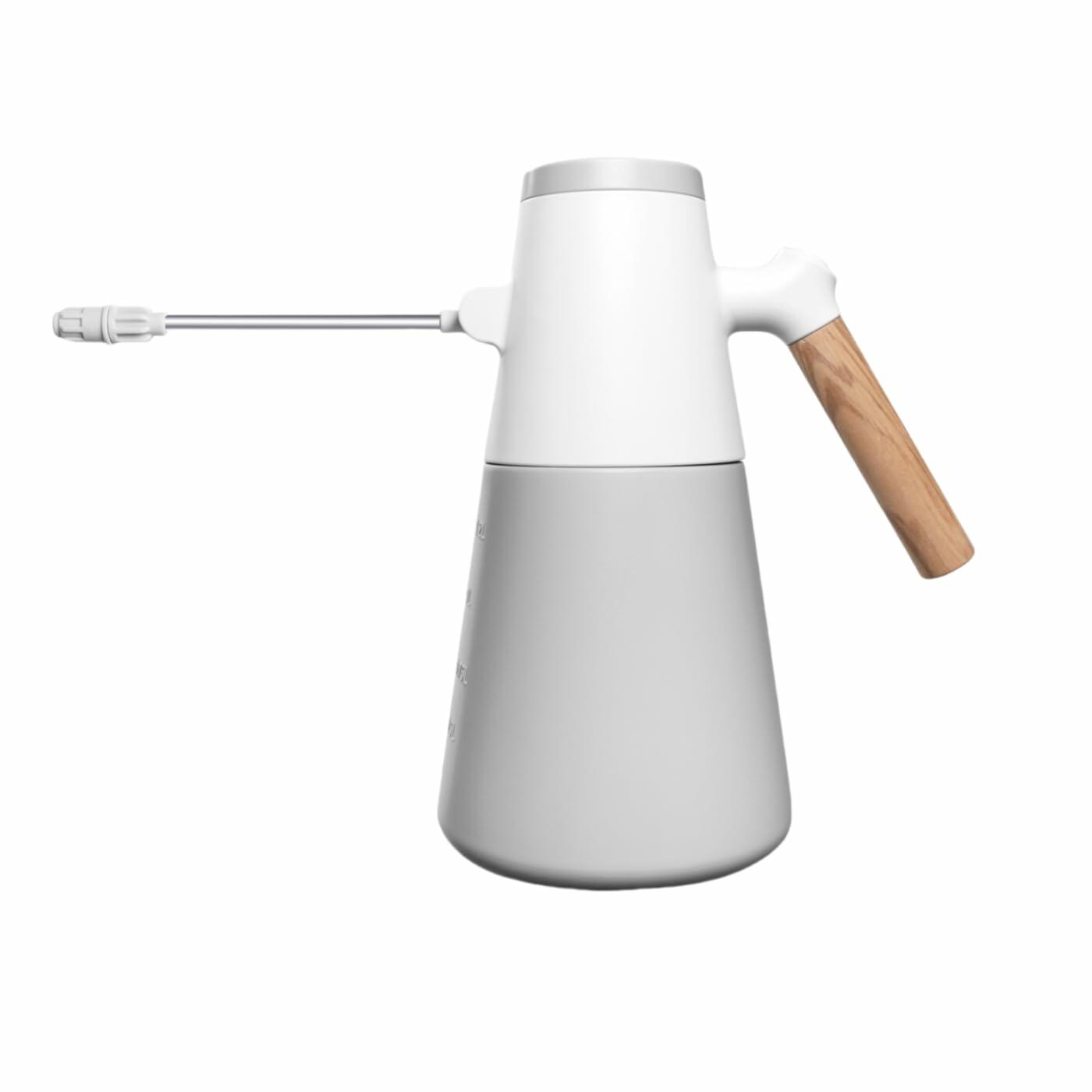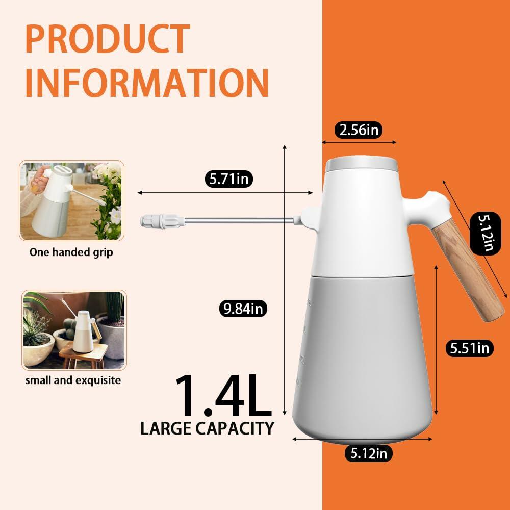 Elevate your plant care routine with this sophisticated electric plant sprayer featuring a generous 1.4L (0.37 gallon) capacity. This battery-powered mister eliminates manual pumping effort, operating smoothly on 4 AA batteries for complete mobility. The thoughtfully designed sprayer includes an adjustable 180-degree nozzle and two distinct spray patterns, giving you precise control over water distribution. Its extended spout allows easy access to plants at various heights, while the elegant wood grain handle provides comfortable grip during extended use. The sleek white and gray design adds a modern touch to your gardening arsenal. Weighing just 2.5 pounds, this lightweight tool reduces hand fatigue during extended watering sessions. The sprayer excels in various applications - from nurturing delicate indoor plants to maintaining outdoor gardens and greenhouse environments. With dimensions of 12 x 6 x 10.5 inches, it's perfectly sized for both storage and functionality. The durable construction ensures reliable performance for all your plant misting and watering needs, making it an essential tool for any plant enthusiast.FEATURES