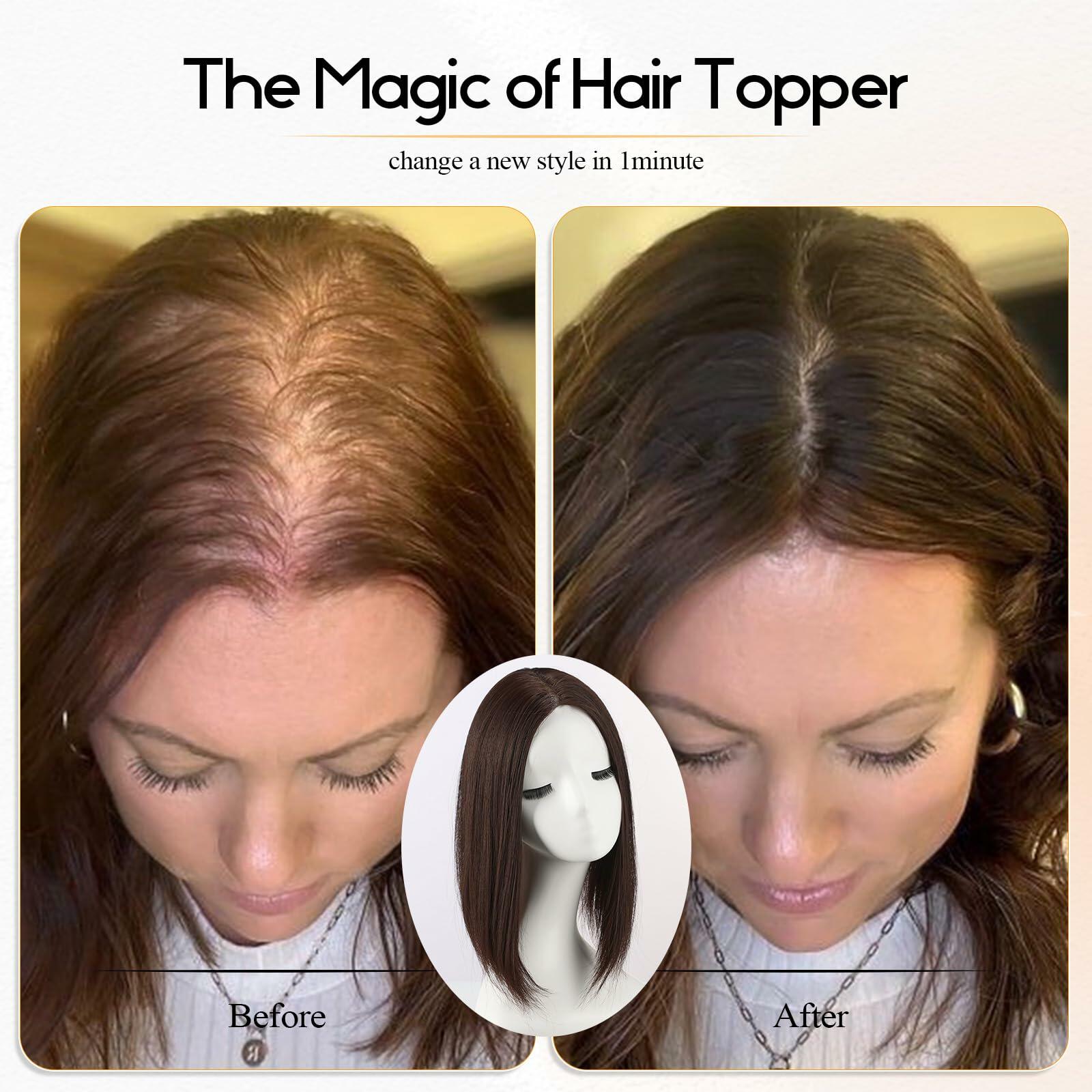 - [Widely Used] Hair toppers are the perfect option for women who want to increase their hair volume for beauty, either women with thin hair or those who just want to change their hairstyle. It can perfectly cover areas with thin or white hair and blends well with your original hair, naturally like hair growing from your own scalp. Ladies who are suffering from mild hair loss, white hair, grey hair, high hairline, wide hair seam and hair damage will gain a natural fluffy hairstyle
