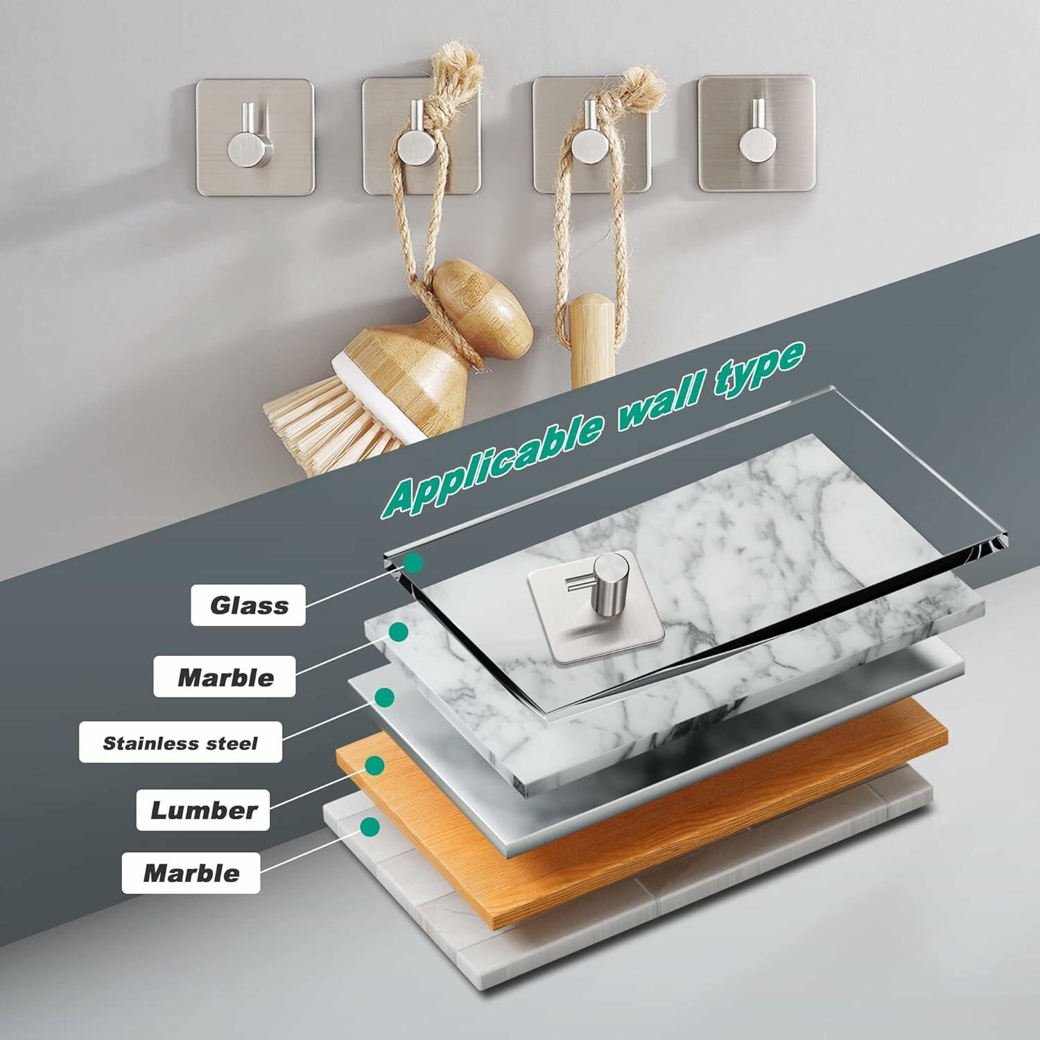 - 【APPLICABLE SURFACES】 The bathroom hooks can be easily bonded to glass, marble, wood, metal, plastic, tile and other smooth hard surfaces. (Not suitable for wallpaper or painted wall).