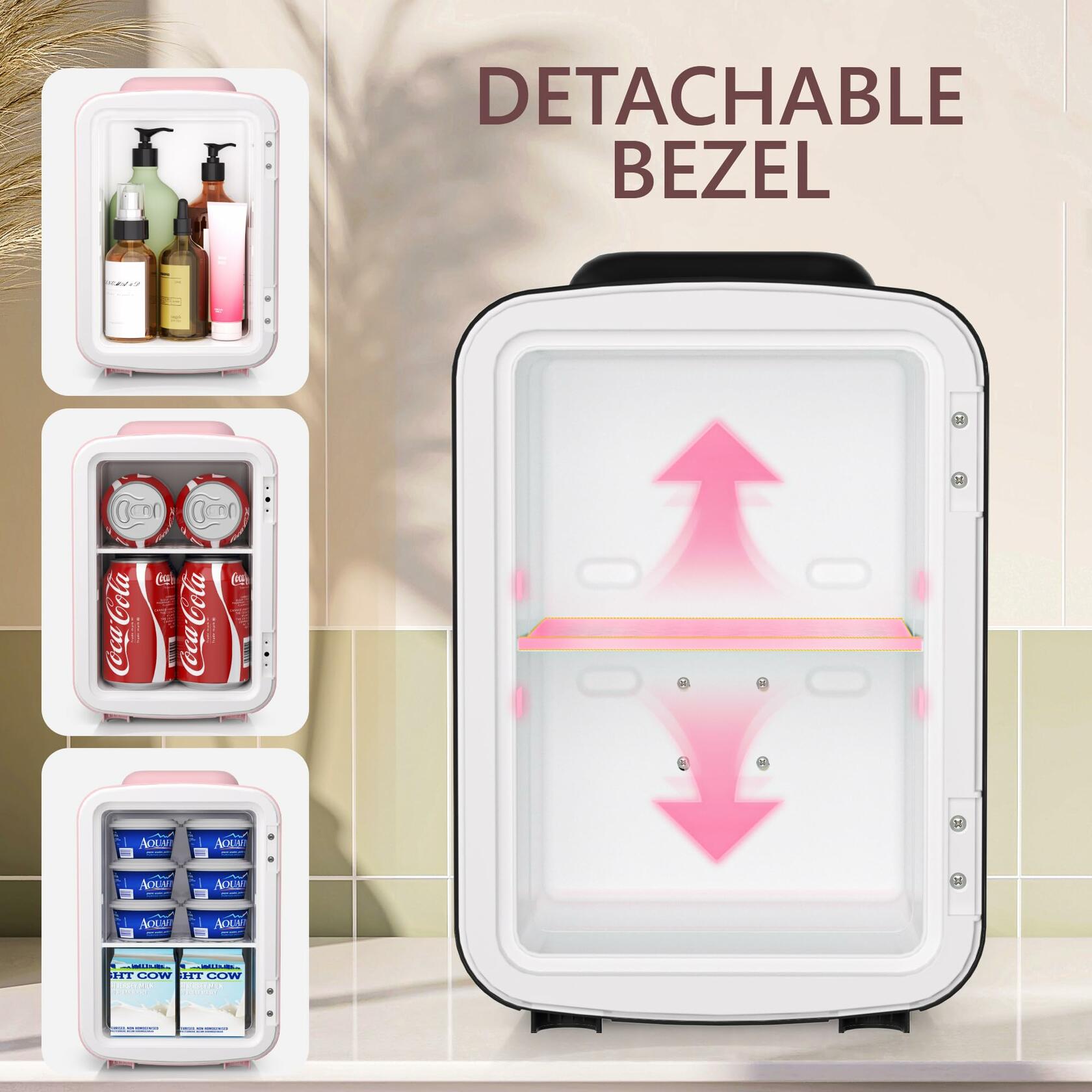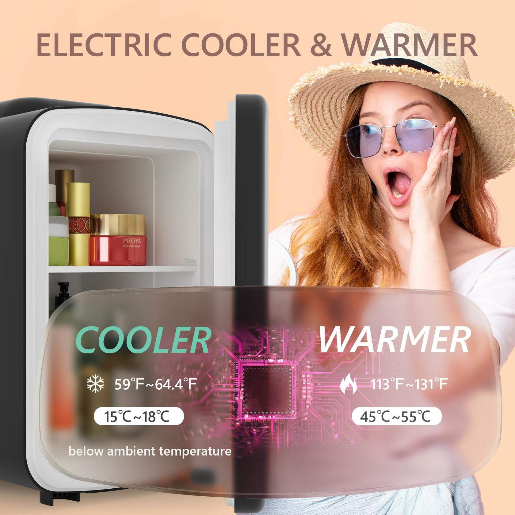 - Cold and Warm Dual Use:To set the mini fridge to cool or heat, just flip the switch. The inside of the mini refrigerator cools 69.8°F (21°C) below ambient temperature and can heat up to 132°F (55.5°C). The mini fridge has two modes and is ideal for storing cosmetics, baby breast milk, fruit snacks, hot and cold drinks, and medications