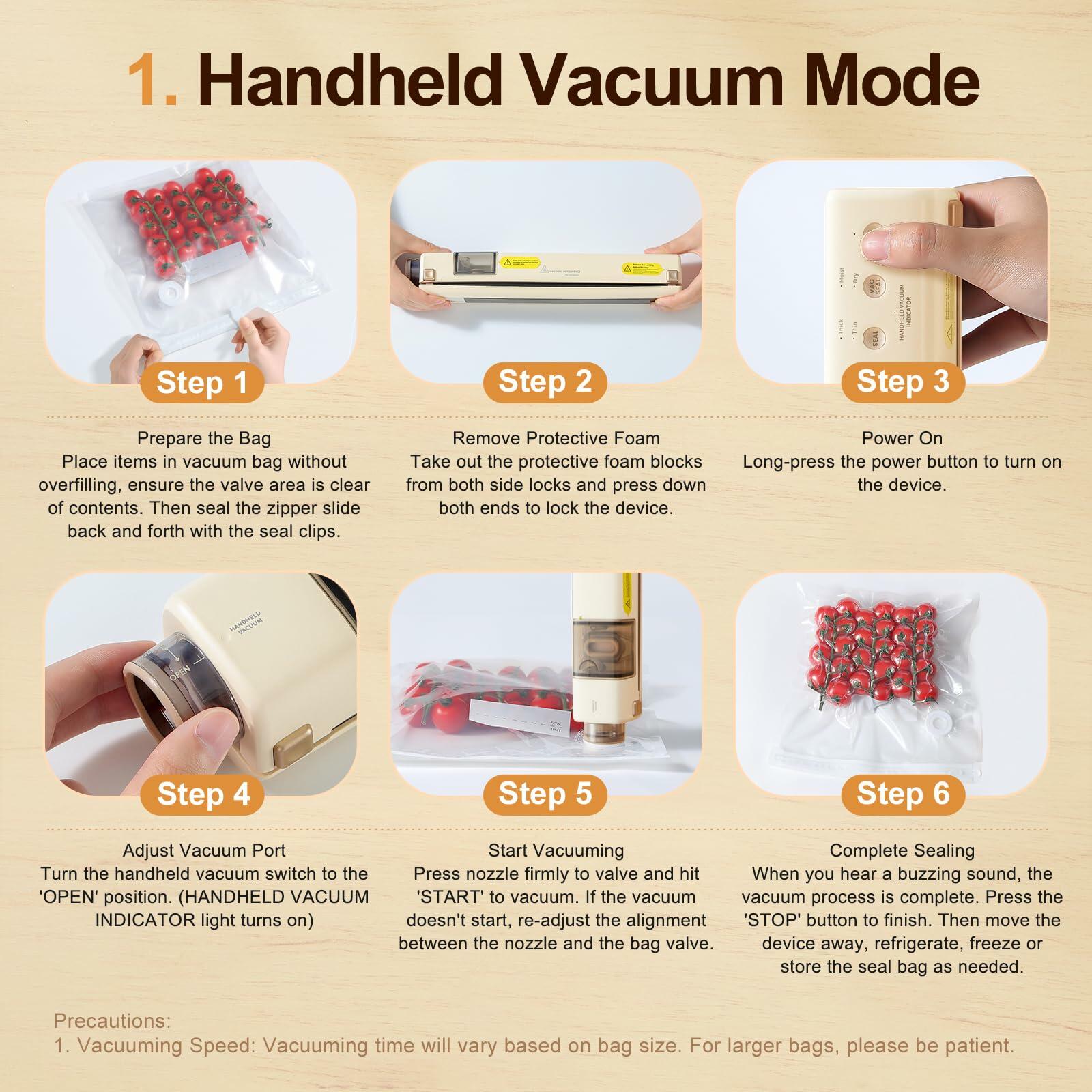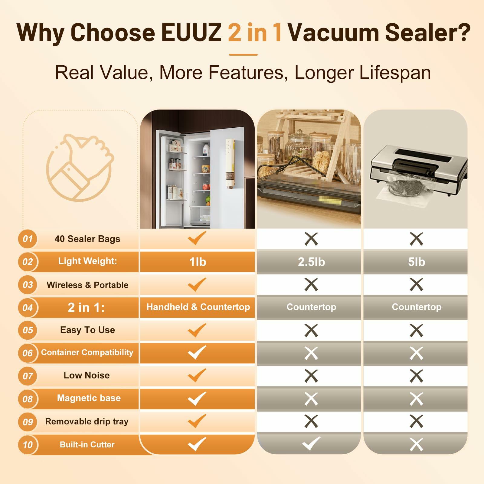 - 2-in-1 Handheld & Desktop Vacuum Sealer: Powerful & Versatile: The EUUZ vacuum sealer is a compact vacuum sealer that works as both a handheld vacuum sealer for food and a countertop vacuum sealer machine. With strong suction, it seals vacuum sealer bags for food, Mason jars, and canisters. No need for multiple devices!