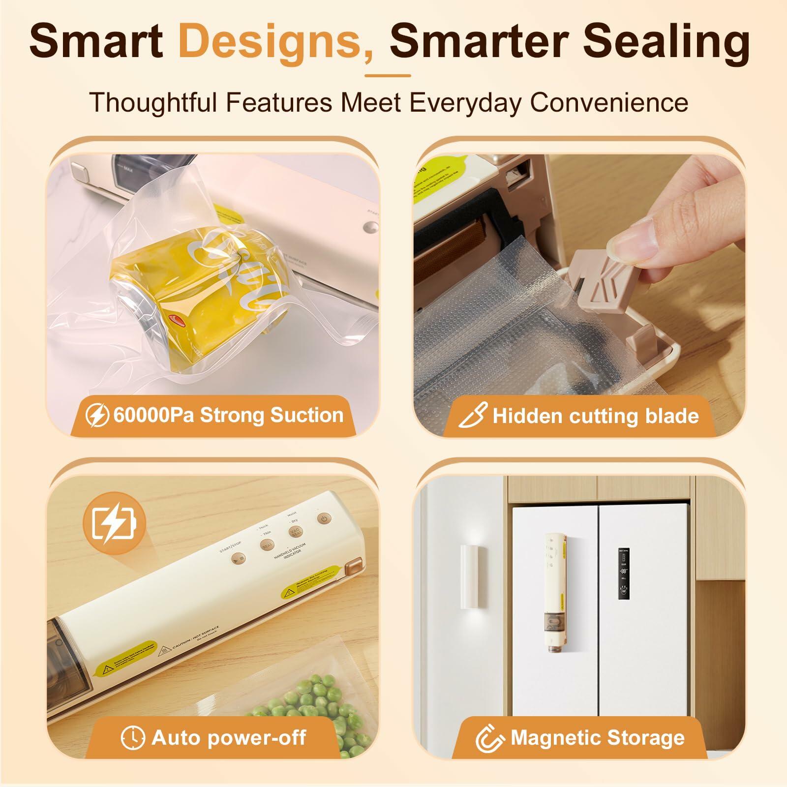 - Powerful & Worry-Free Vacuum Sealing: With a 1500mAh long-lasting battery, this food sealer seals up to 1,000 bags per charge. The built-in cutter customizes bag sizes. Auto shutoff ensures safety. Enjoy peace of mind with our 60-day no-reason refund policy, 1-year warranty, and dedicated customer support for worry-free use!