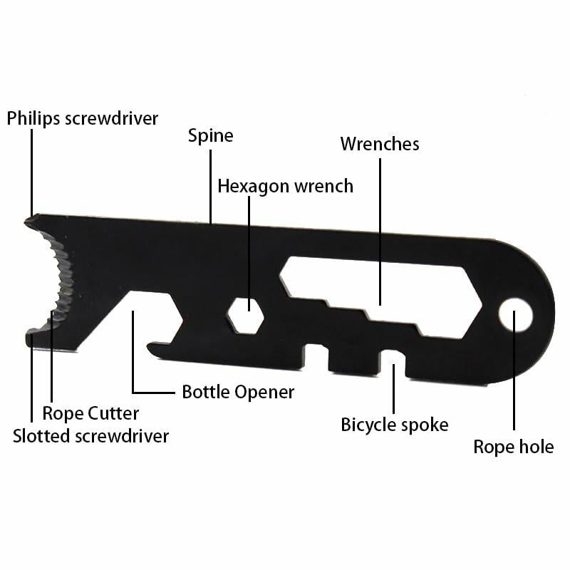 - Included a Multi-tool Scraper that can be used as: Philips Screw driver, Spine, Hexagon Wrenches, Rope Hole, Bicycle Spoke, Bottle Opener, Rope Cutter, Slotted Screwdriver