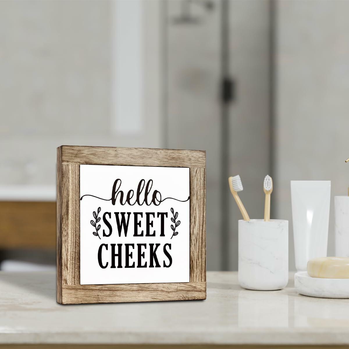 Farmhouse Rustic Wooden Bathroom Sign 'Hello Sweet Cheeks' Plaque Decor
