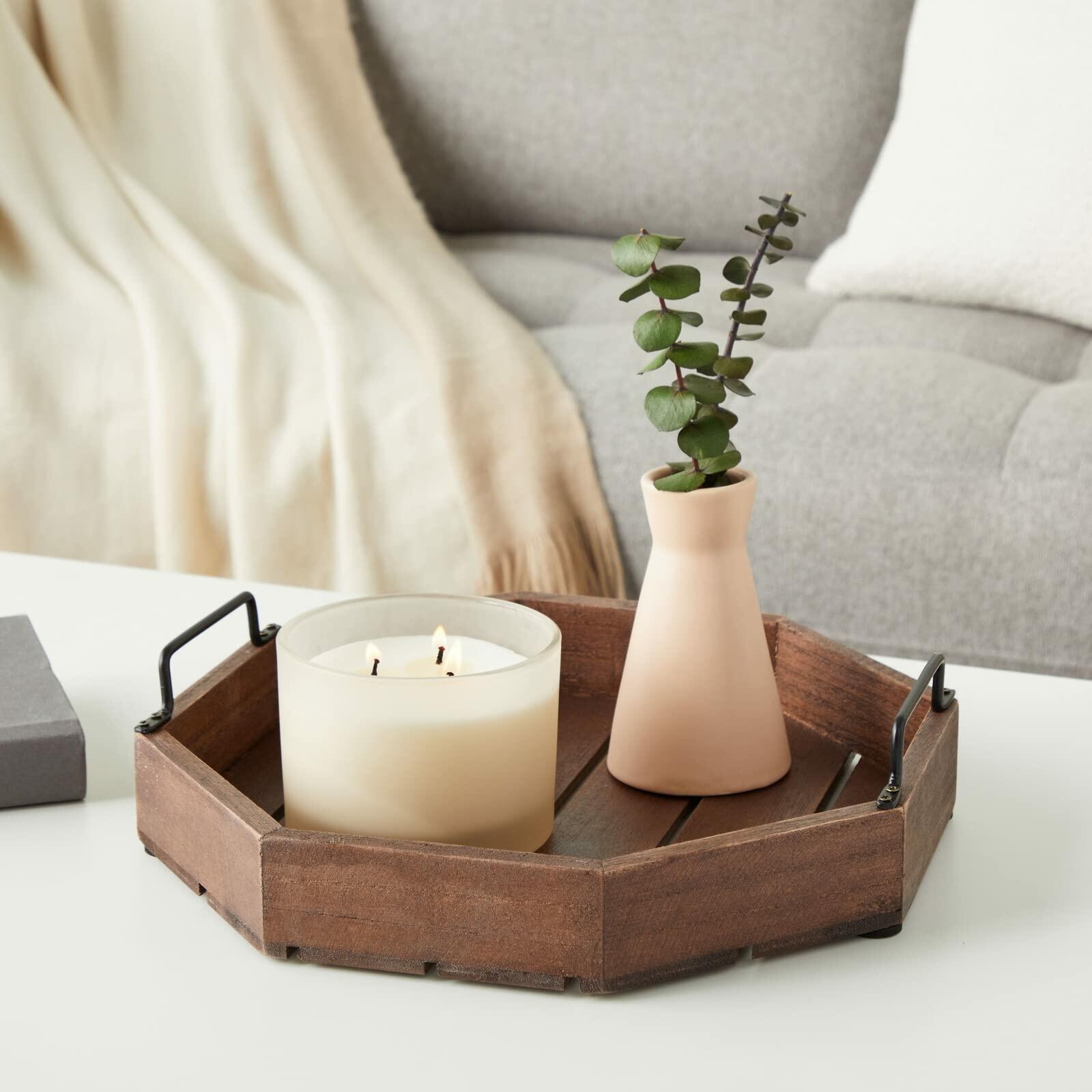 The Farmlyn Creek Decorative Rustic Wooden Serving Tray is a versatile and stylish addition to your home decor. Crafted from quality paulownia wood with a polished finish, this dark brown octagonal tray is both functional and aesthetically pleasing. The tray's rustic metal handles provide a secure grip, making it easy to transport and serve a variety of items. Measuring 11.75 x 11.75 x 2.75 inches, it is perfectly sized for various uses around the home. Ideal for those who appreciate farmhouse style, this decorative tray can be used by anyone looking to organize or enhance their living space. It's perfect for serving drinks, appetizers, or breakfast in bed, allowing you to treat your guests or loved ones with elegance and ease. Additionally, the tray can be used as a centerpiece on a coffee table or ottoman, displaying candles, flowers, or other decorative items to create a warm and inviting atmosphere. The tray also serves as an excellent organizational tool, helping to keep small household items like remote controls, keys, or sunglasses neatly arranged on your bathroom vanity, kitchen countertop, or living room ottoman. Its reusable nature ensures that it remains a staple in your home decor for years to come. When it comes to maintenance, this wooden tray requires minimal care—simply wipe it with a dry cloth to keep it looking pristine. Whether used as a serving tray with handles or as a decorative tray for your home, the Farmlyn Creek Wooden Tray offers both practicality and charm, making it a must-have for those who appreciate both style and functionality in their home accessories.