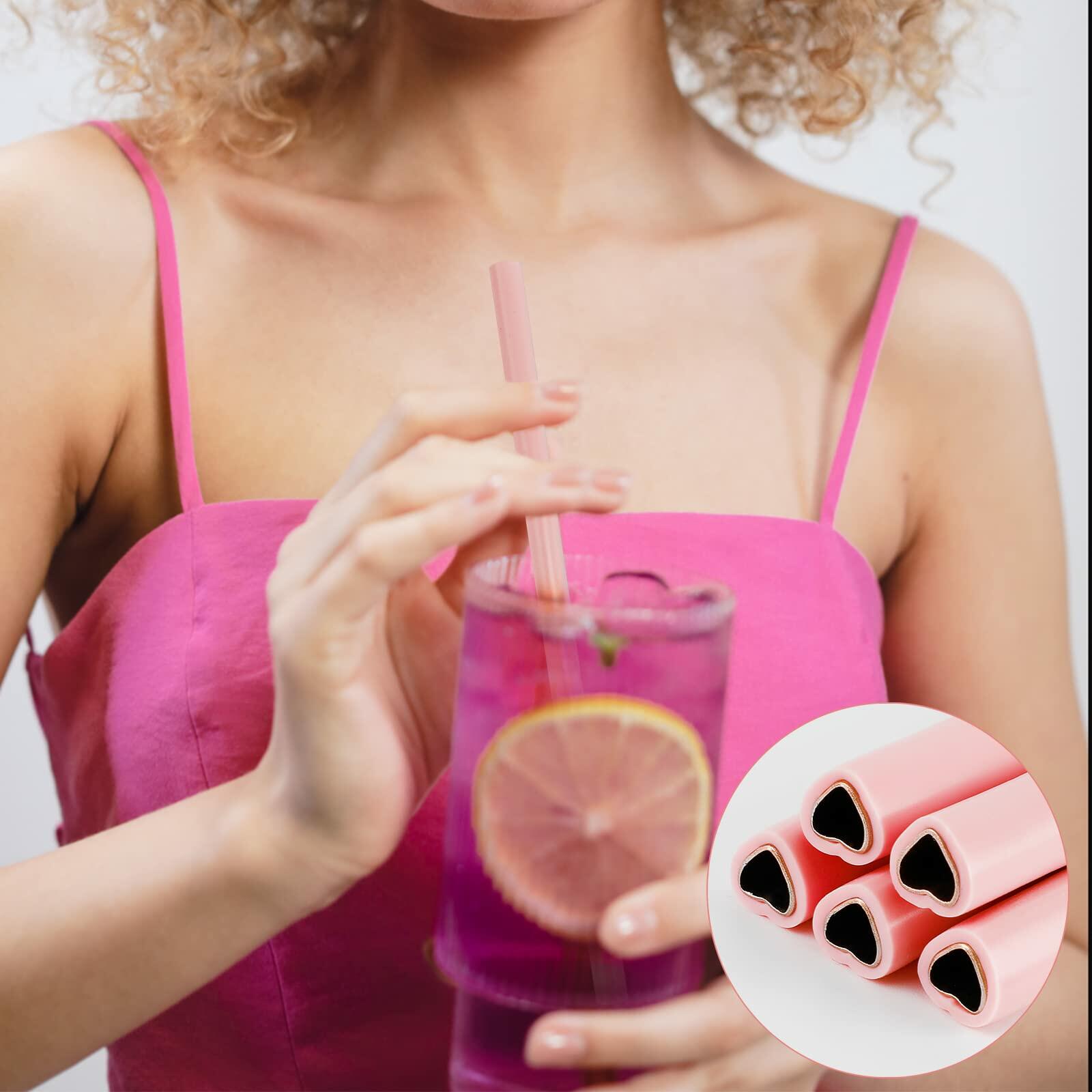 Fepibur 10Pcs Pink Heart Stainless Steel Straws with Silicone Tips & Brush