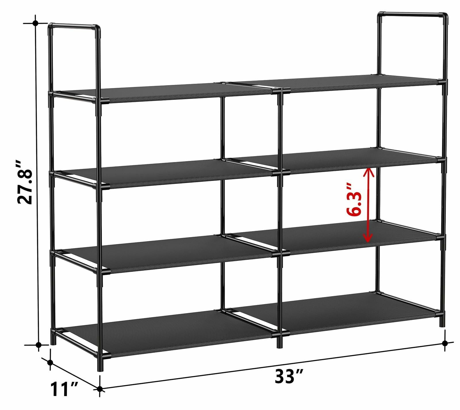 MATERIAL & STRUCTURE: This shoe rack shelf organizer made from durable waterproof non-woven fabric tiers, strengthened plastic connectors and thickened iron pipes. The short shelf design ensures minimal bending, even under the weight of large and heavy items. The central pole support reinforces the entire structure, making the shoe rack more robust and stable, with an extended service life. STORE CAPACITY: 4-tier shoe rack can hold up to 16-20 pairs of adult shoes, this shoe shelf is not only for shoes, but also for sneakers, heels, boots and slippers. MEASURES: 33"L x 11"W x 27.8"H, perfectly storage for your closet, entryway, front door entrance, garage, hallway, bedroom, dormitory, apartments, living room. EASY ASSEMBLY: No tools needed, simply assemble the unit by hand with provided parts, please note the assembly of this product is required.