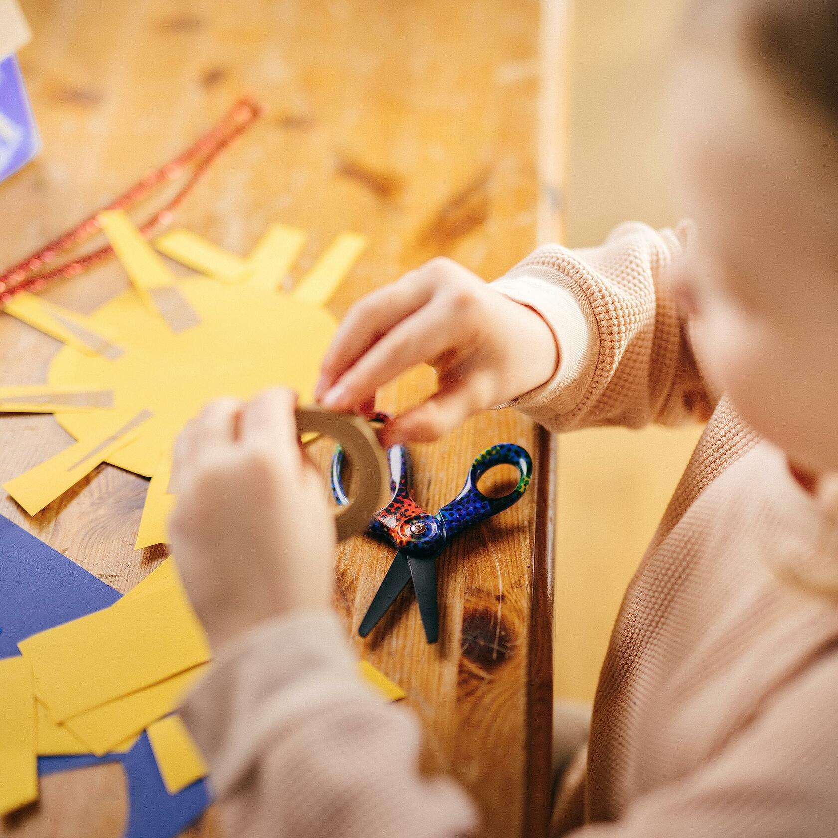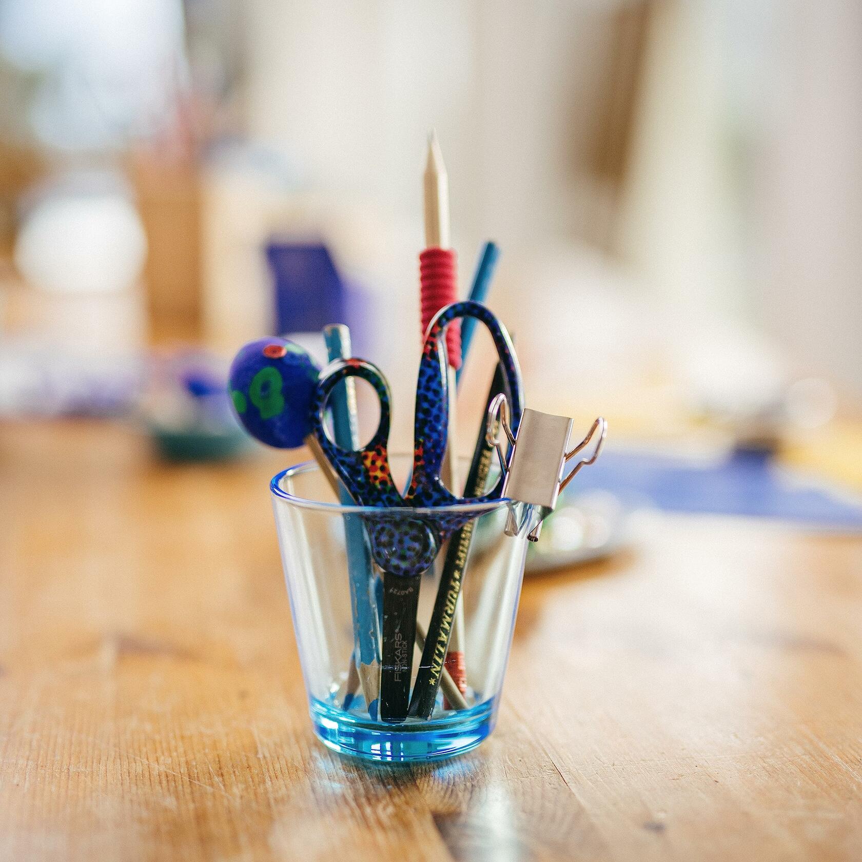 - Fiskars Designer Non-stick Blunt-tip Kids Scissors feature a fun, patterned handle that allows kids to express their personality