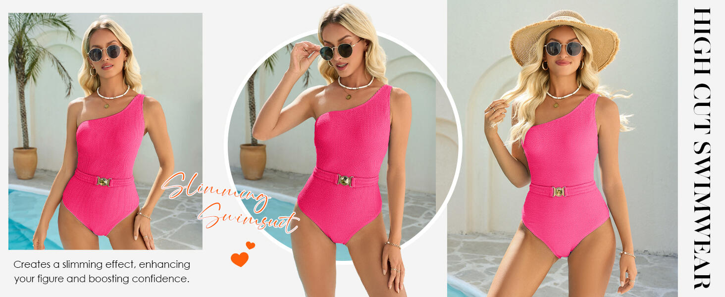 - Feature: Tummy control swimsuits for women features one shoulder, high cut, removable padded, one piece, removable locking belt, full coverage, solid color, textured fabric.