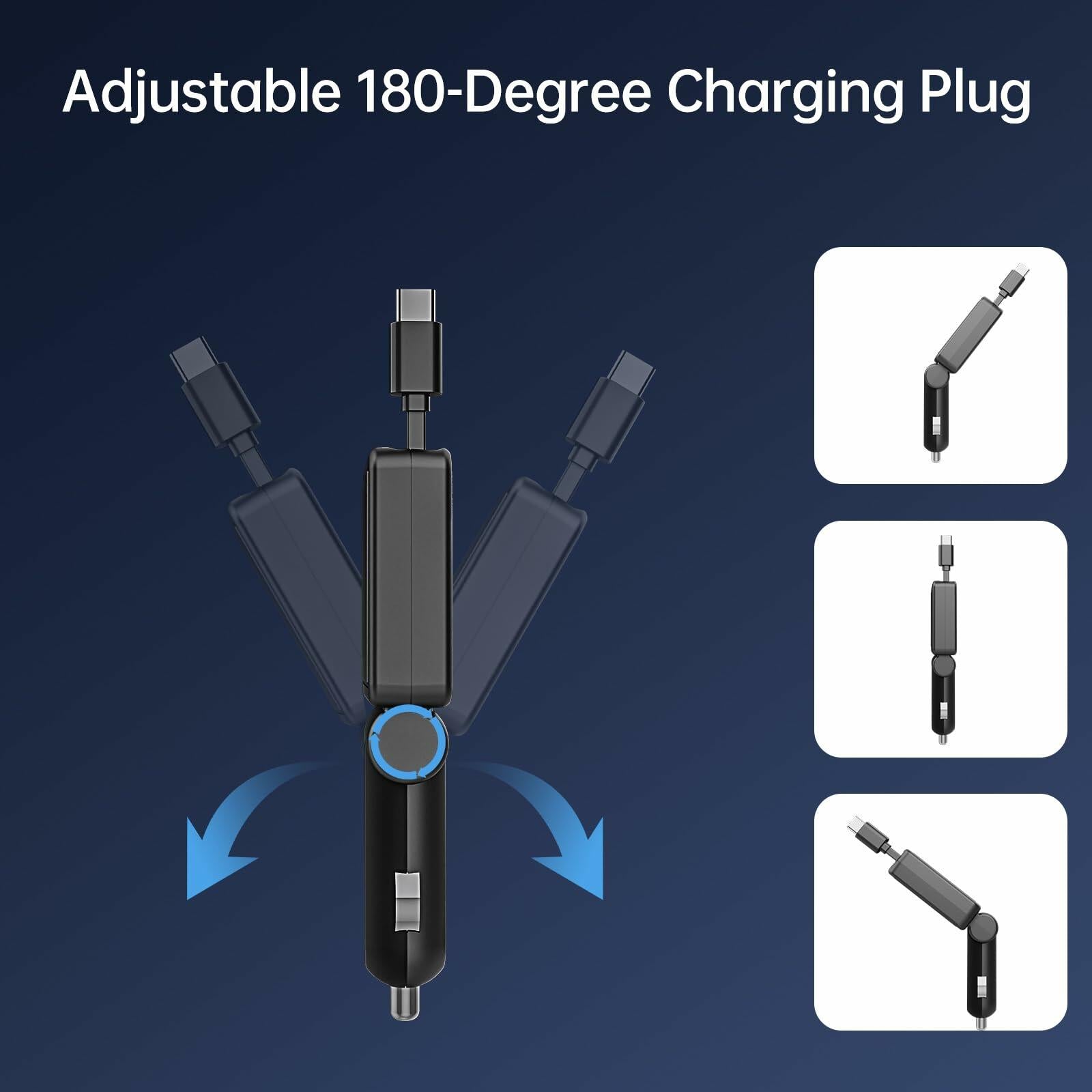 Designed to be 60% smaller than other 4 in 1 retractable car chargers, the FLEXINO car USB charger is compact and easy to carry, making it ideal for travel. Its retractable Type C cord extends up to 2.6ft, reducing cable clutter and keeping your car interior organized.