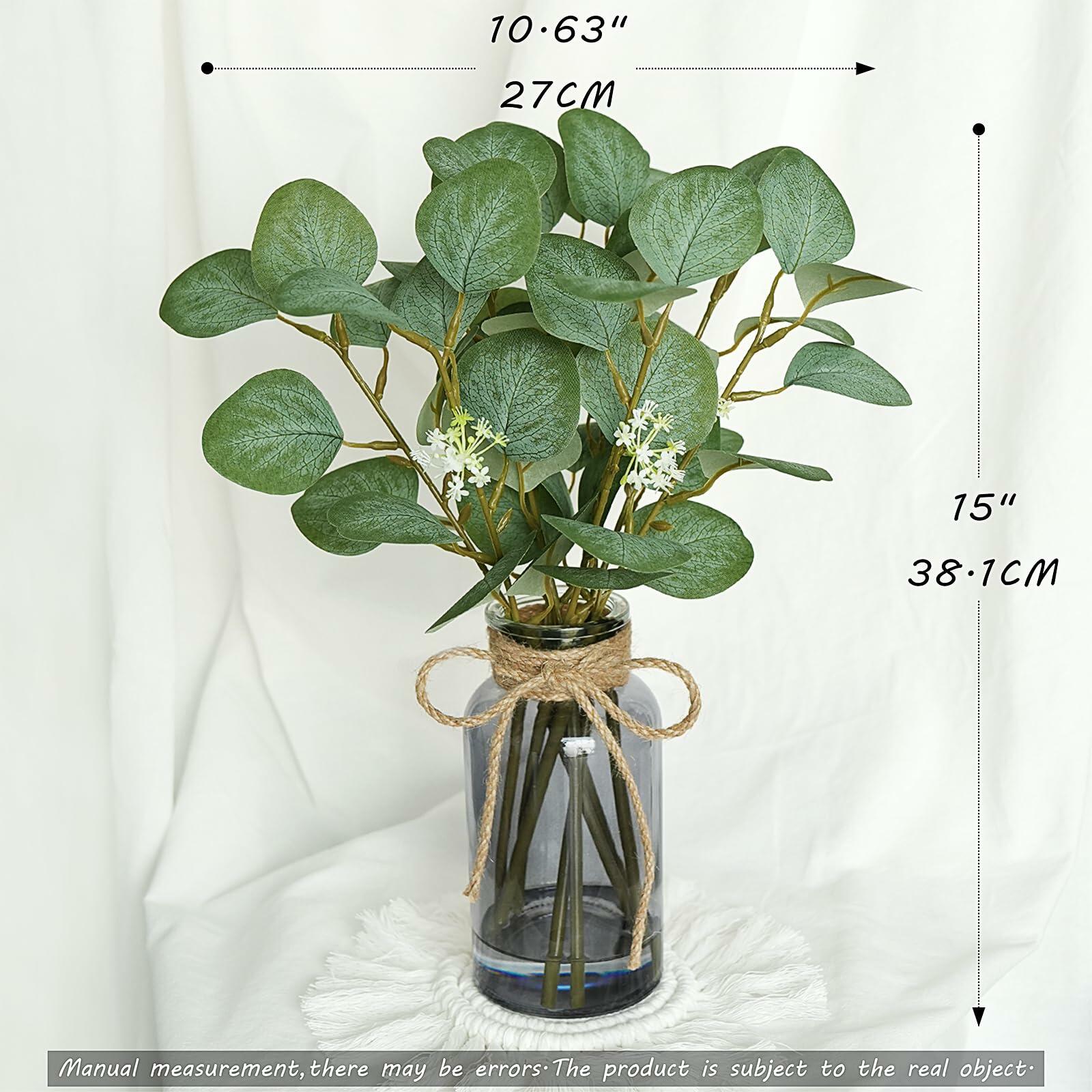 - Size: Artificial eucalyptus stems with vase are approximately 15 inches in total height, The glass vase is 6.5 inches in height and 2.36 inches in diameter