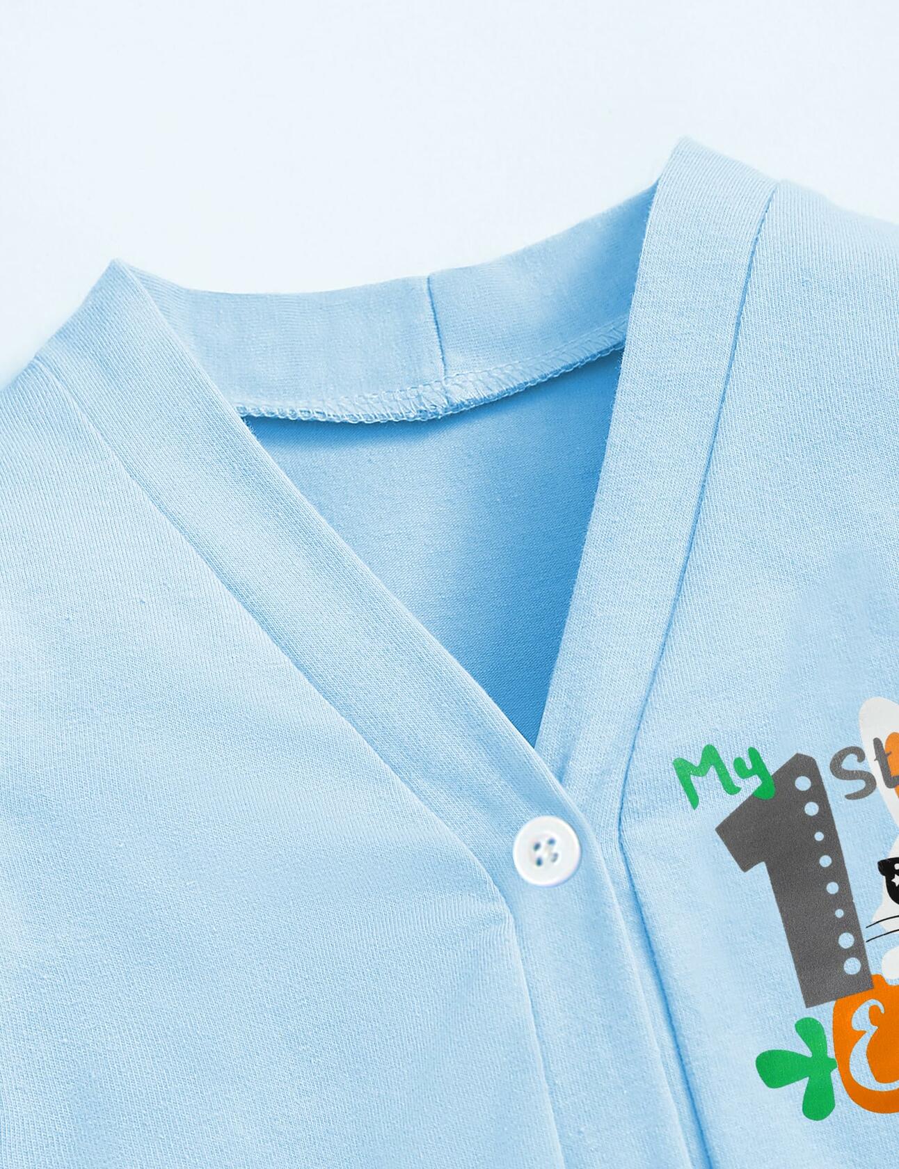 - Design:The baby boy Easter outfit consists of a white inside and a blue outside, a blue top with a "My 1st Easter"rabbit print on the front, pants and hat with the same white small rabbit and carrot print design It's very cute for your baby to wear.
