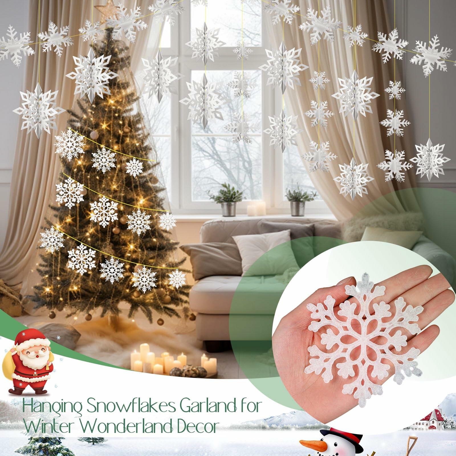 - Quality Material: Christmas snowflake garlands are made of thick cardboard, waterproof and sturdy, so don't worry about hanging them outside; The glittery white snowflake ornaments are made of plastic, when you take it down, can be folded flat for storage