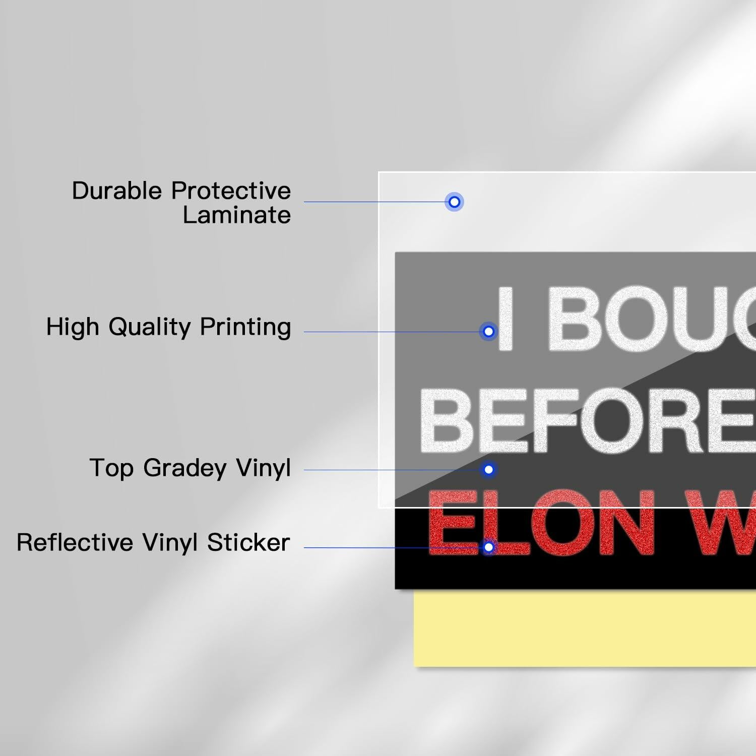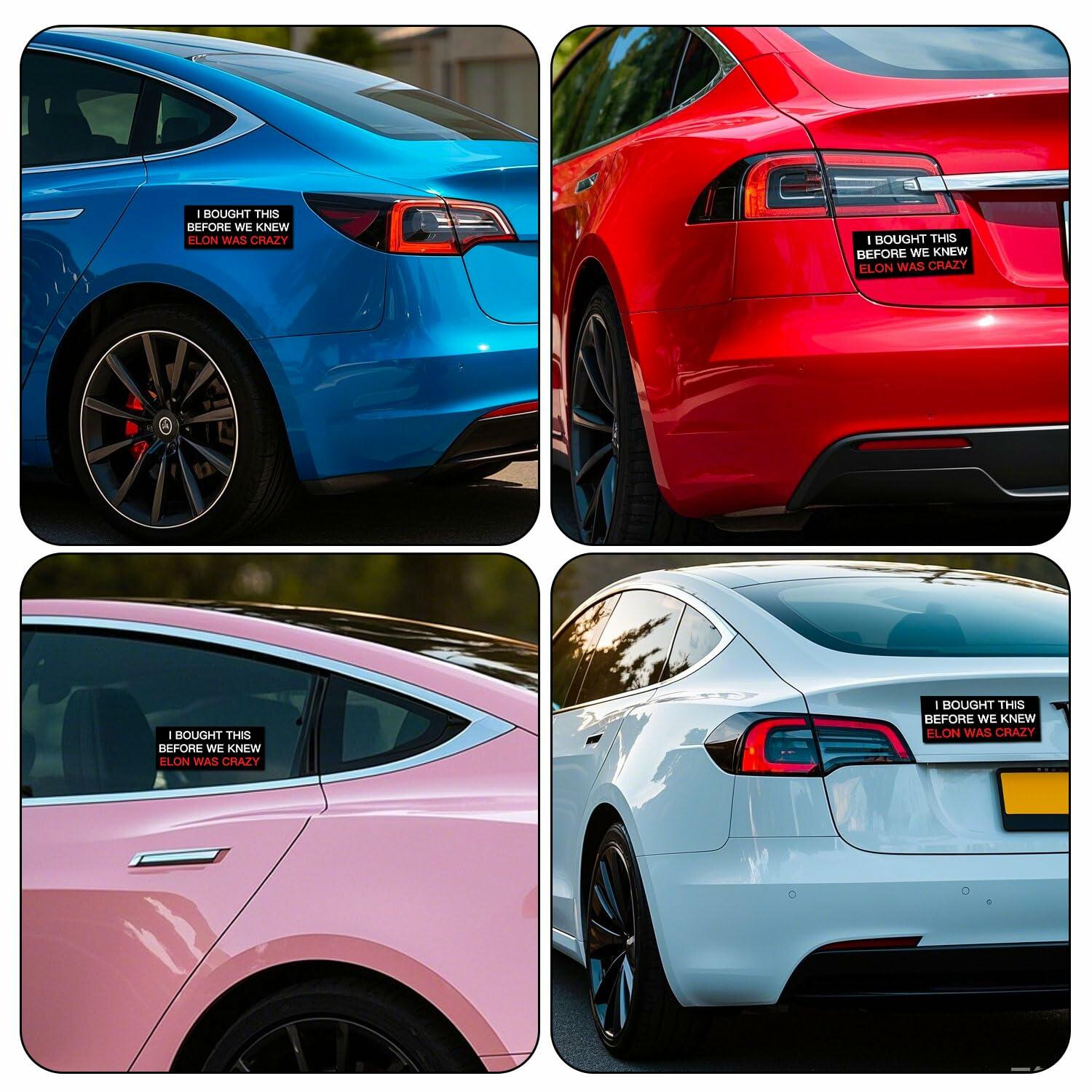 - 【Large 7.5"×3" Tesla Bumper Sticker Anti Elon】Optimized for bold visibility on Tesla bumpers, laptops, and water bottles. Features "I bought this before we knew Elon was crazy" messaging, anti Elon Tesla club branding, and Tesla sticker I bought before humor. Fits flat or curved surfaces effortlessly.