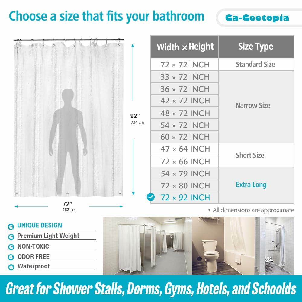- [EXTRA LONG SIZE CURTAIN] - This Curtain is Extra Long Curtain Size(72"x92"). Suit with straight/curved shower rods. Can be used along or as a liner for a fabric shower curtain. No more worrying about fitting it with your favorite fabric shower curtain. Since this is Extra Long Size Curtain, please double check your bath tub size before getting it.