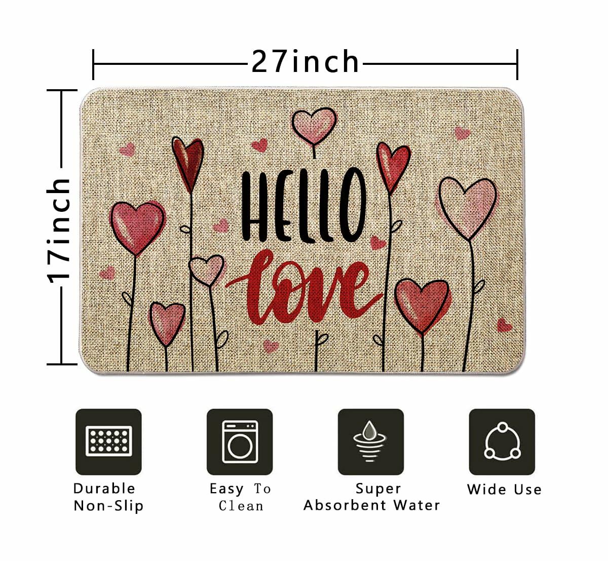 Valentines Day Door Mat Rug Hello Love Hearts Decorative Welcome Doormat Outdoor Indoor Farmhouse Entrance Rugs Anniversary Wedding Decor Home Kitchen Floor Front Door Mats 17 x 27 Inch