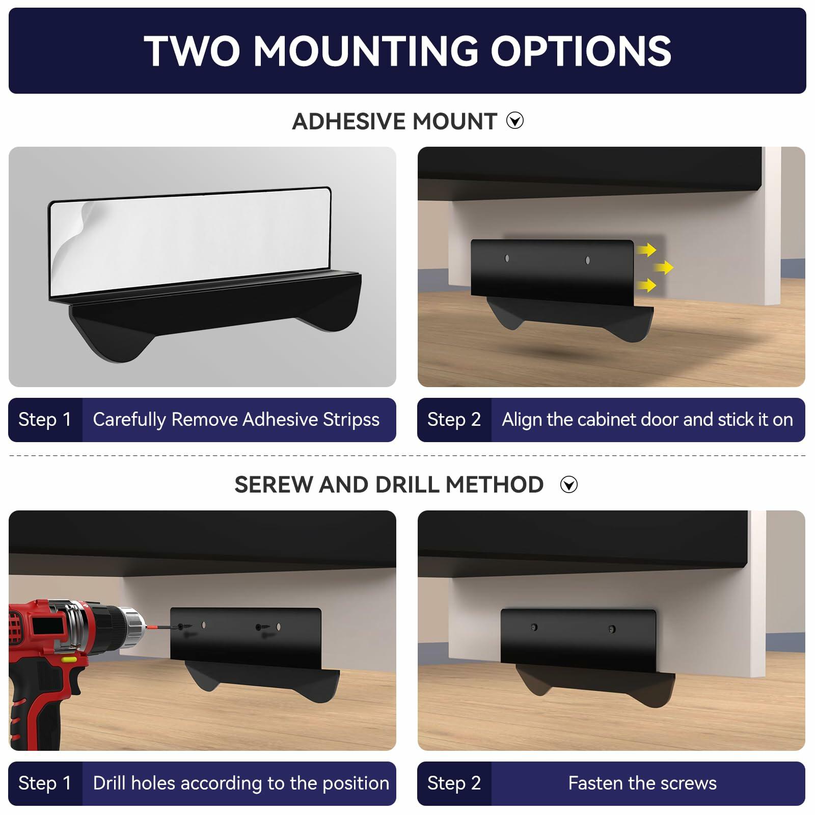 - Two Installation Options: The cabinet foot pull for the trash drawer offers you the choice of either adhesive attachment or the screw and drilling method for installation. Choose according to your preference. Adhesive Mount: After ensuring that there is no dirt or dust, align with the middle position below the cabinet door and use double-sided tape to attach the handleless handle to the back of the cabinet. Wait 1 hour before use. Or install it by drilling holes with screws