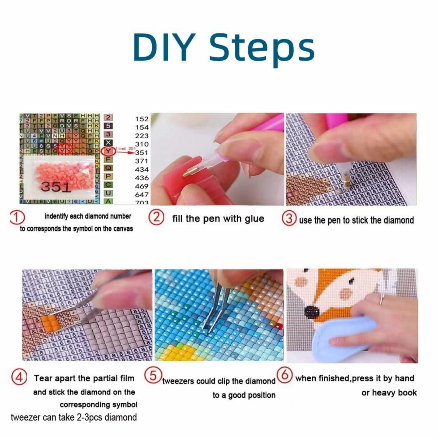 - 【DIY PRODUCTION STEPS】 : Firstly, place the same diamonds in tray, then take the pen insert to the square adhesive lightly, leave some adhesive on the pen, finally pick up the diamond and place it on the corresponding number on the canvas