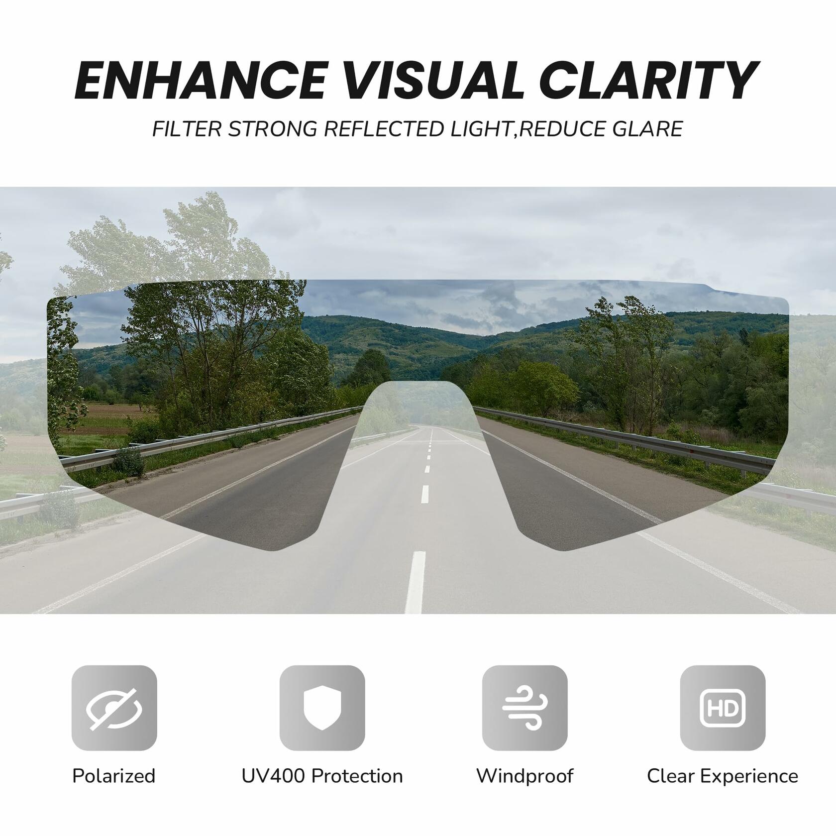 - ENHANCED VISION: Features HD UV400 and polarized lens. Effectively blocks 99.99% of harmful UV rays. Reduces glare interference, sunlight resistant and provides clear vision.