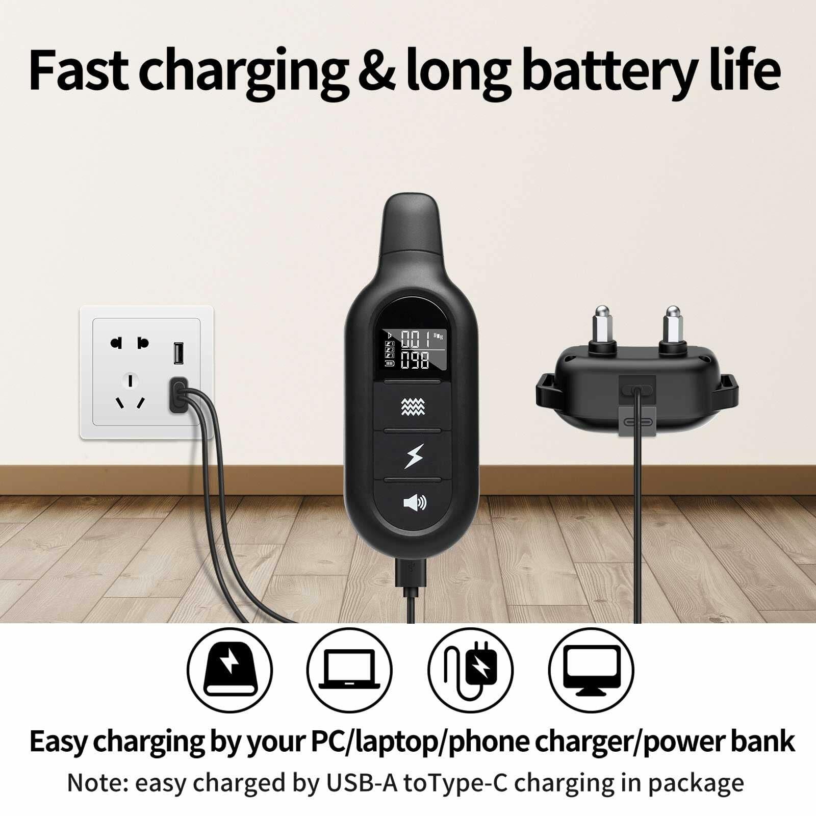 - 【Incredible Battery Life & Quick Charging】Rechargeable remote and receiver,You can charge the electric dog collar with your power bank, phone charger or laptop USB charging port.After 2 hours of fully charging, Maximum 180 days on remote control, 60 days on receiver, over 200 days on standby