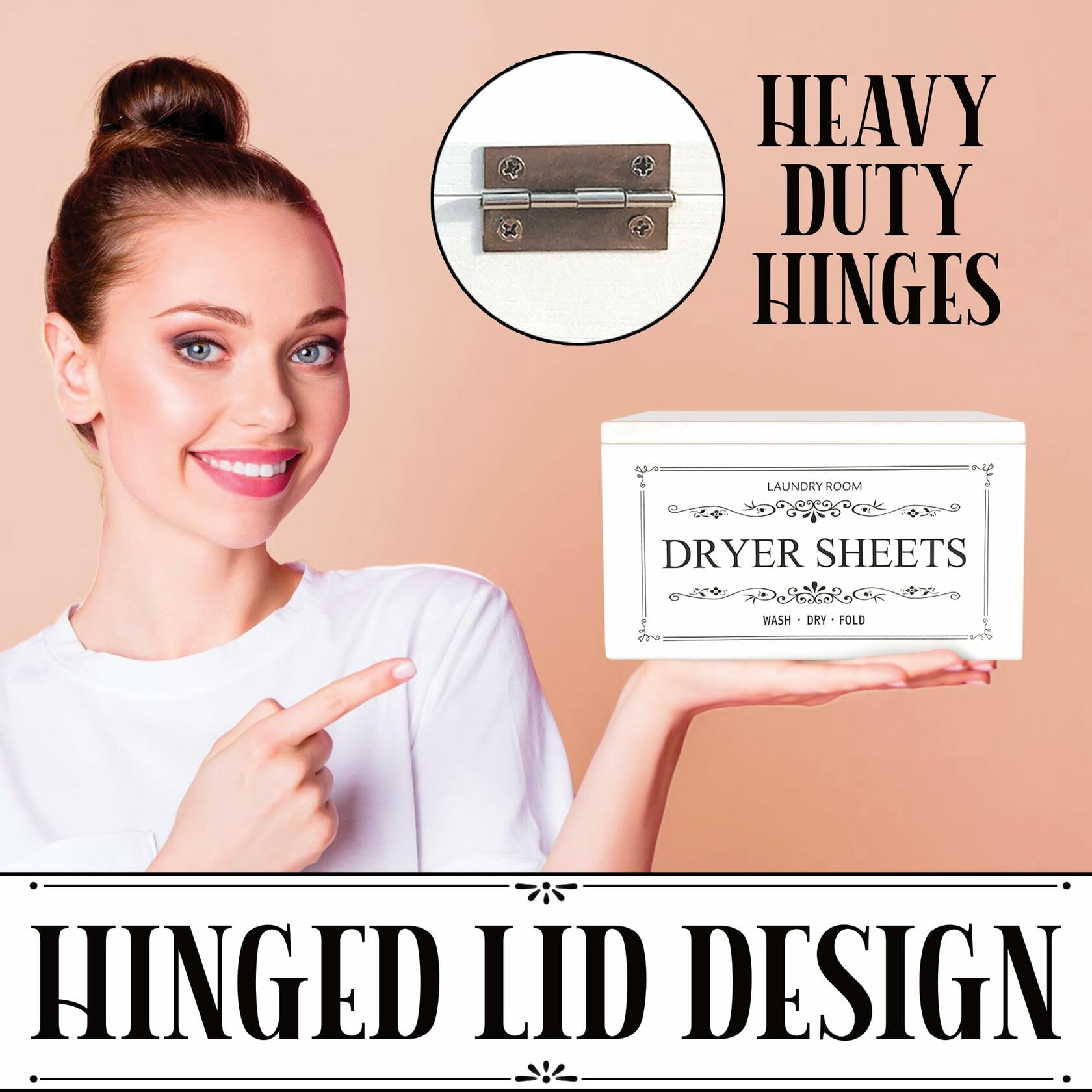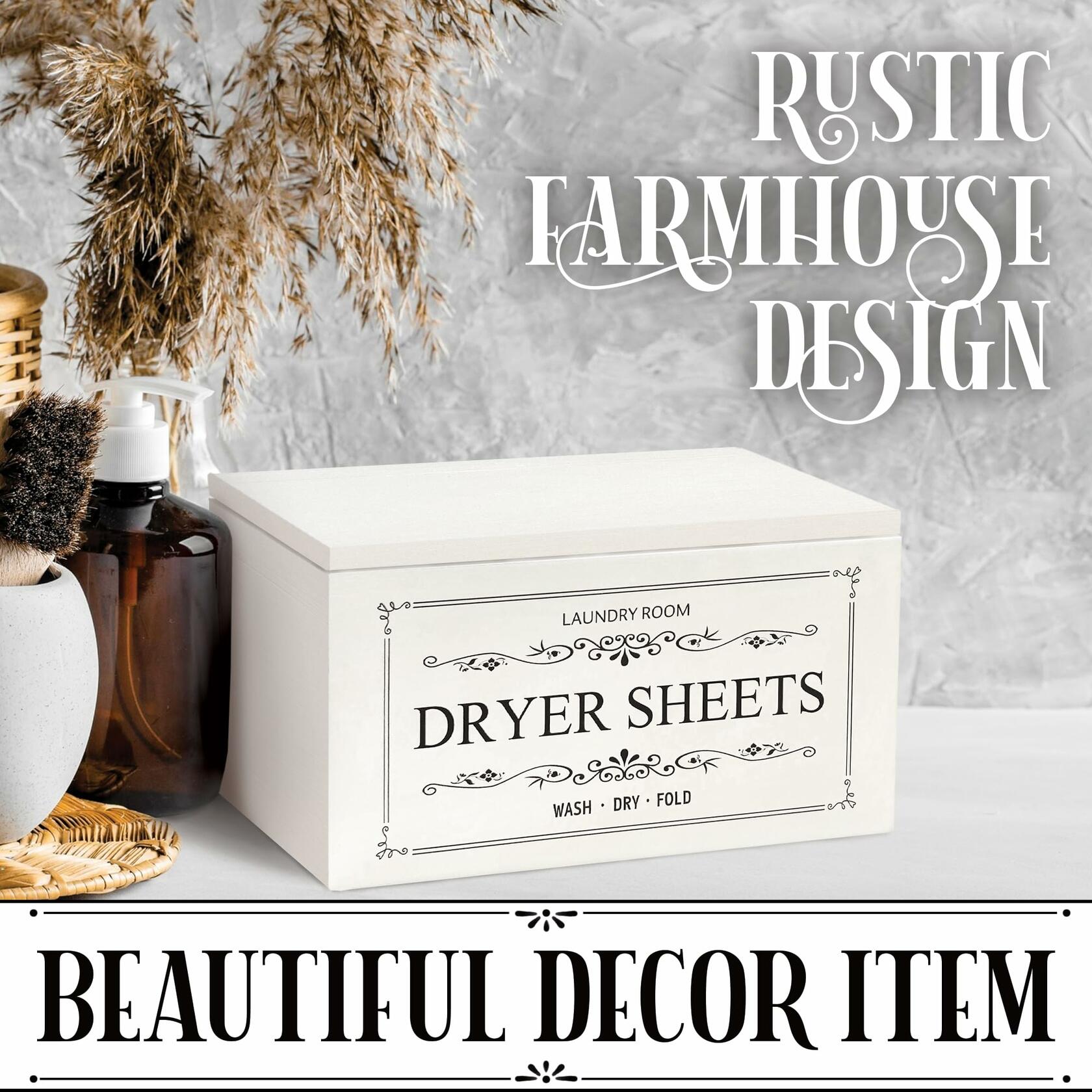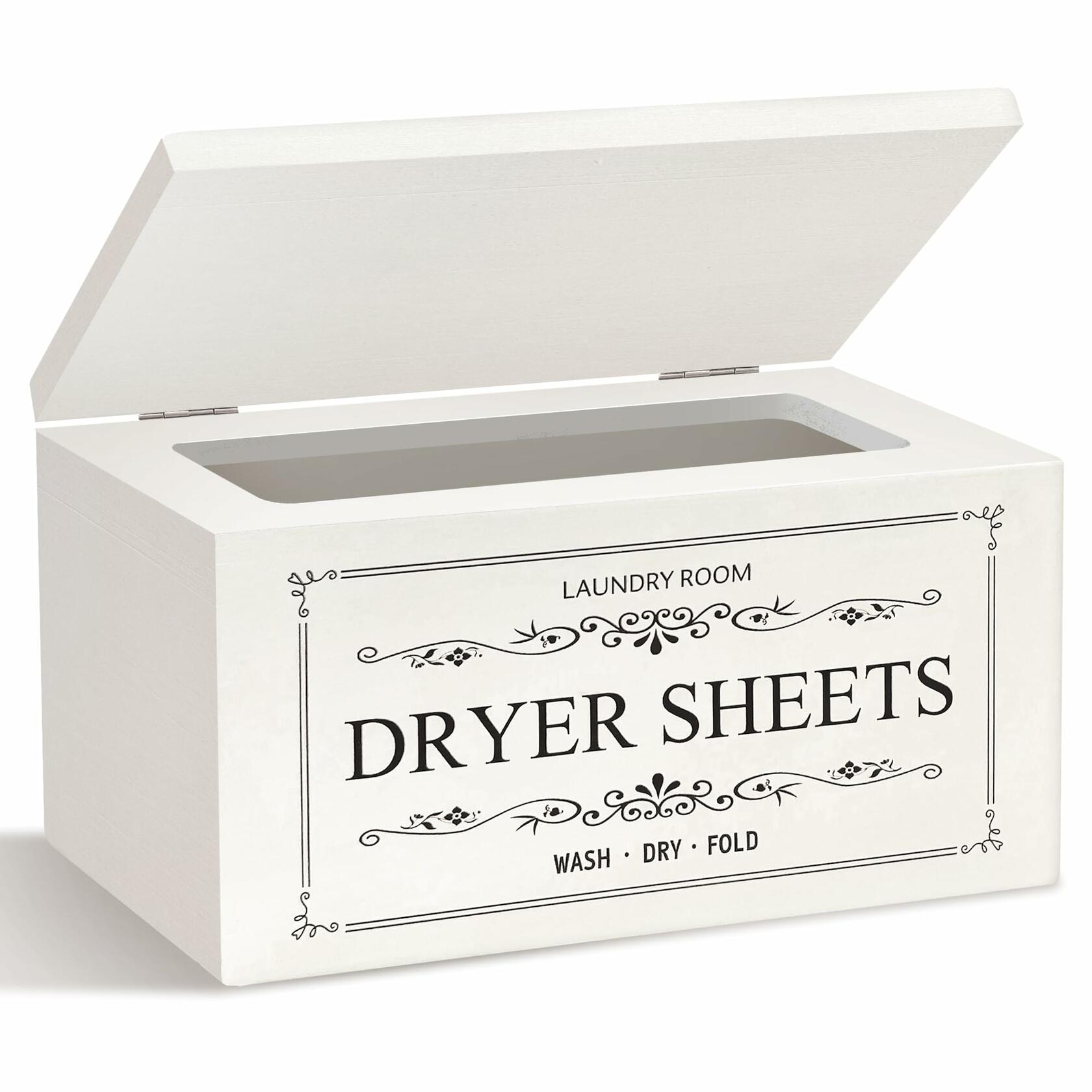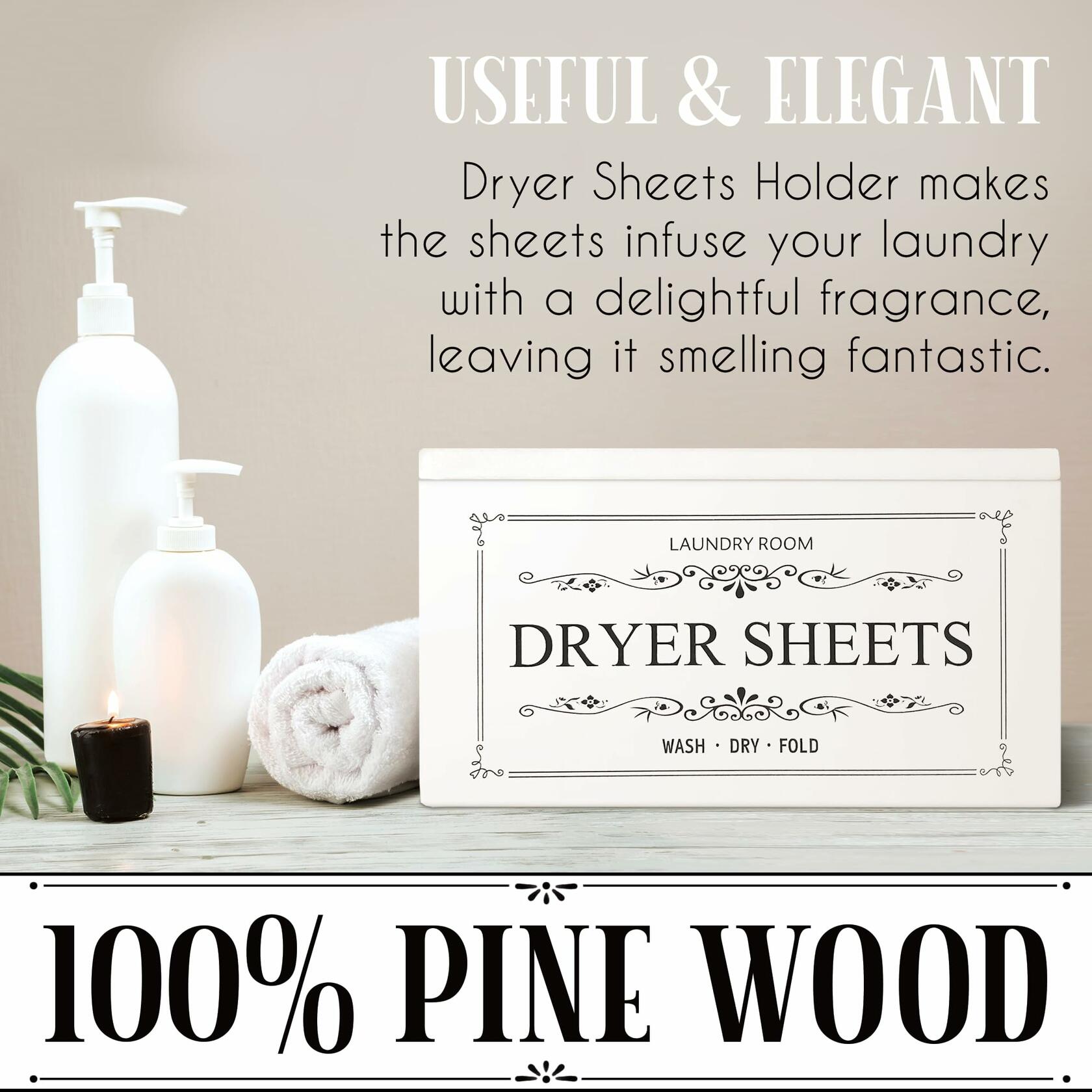 - [QUALITY BUILT] Dryer Sheets Holder Dispenser is 100% solid pine wood is perfect as laundry organizers and storage in any laundry room, Dryer Sheet Box allows you to keep up to 180 dryer sheets then it can holds a whole standard sized fabric softener sheets. This cute laundry containers simplifies your laundry routine, making it a breeze to add dryer sheets to every load.