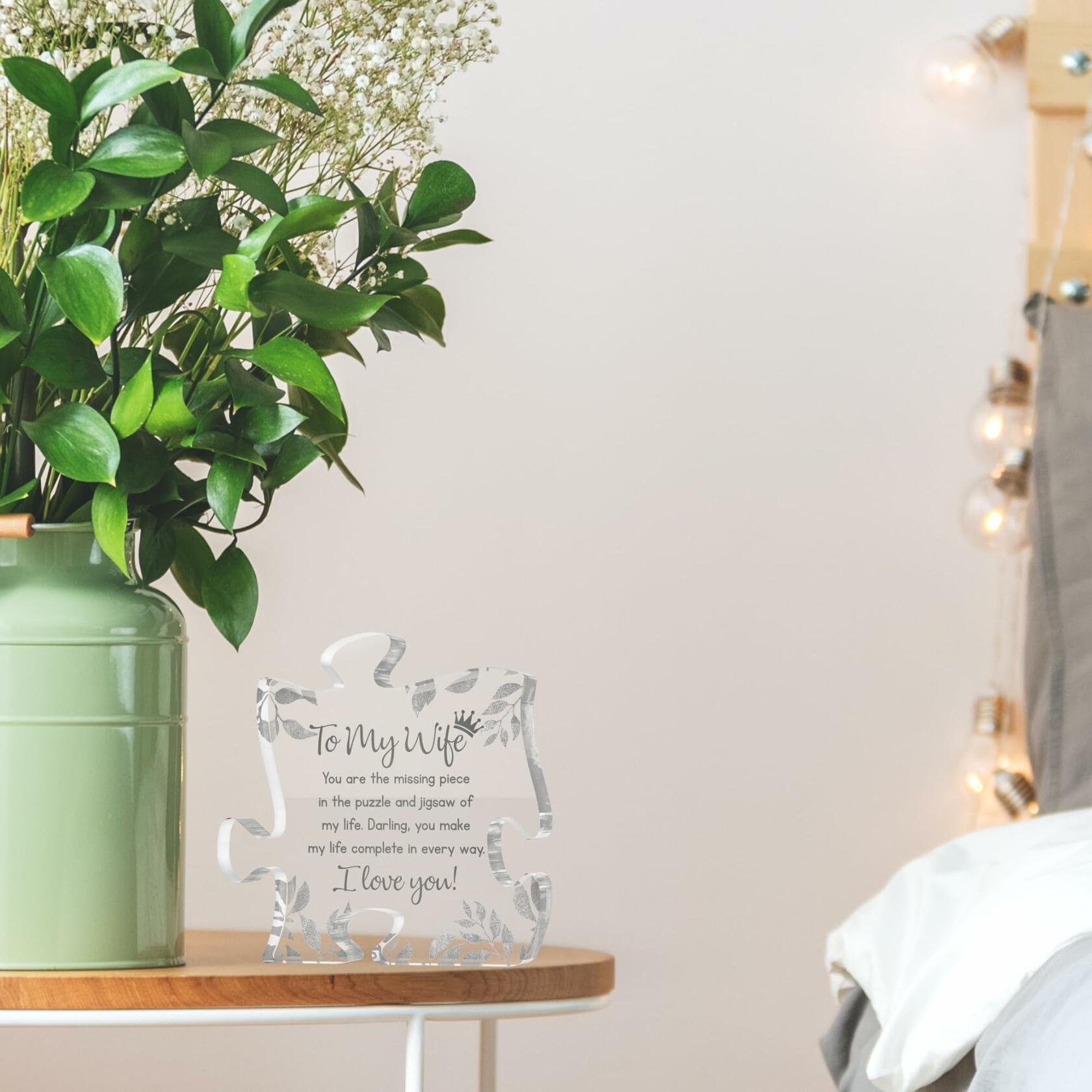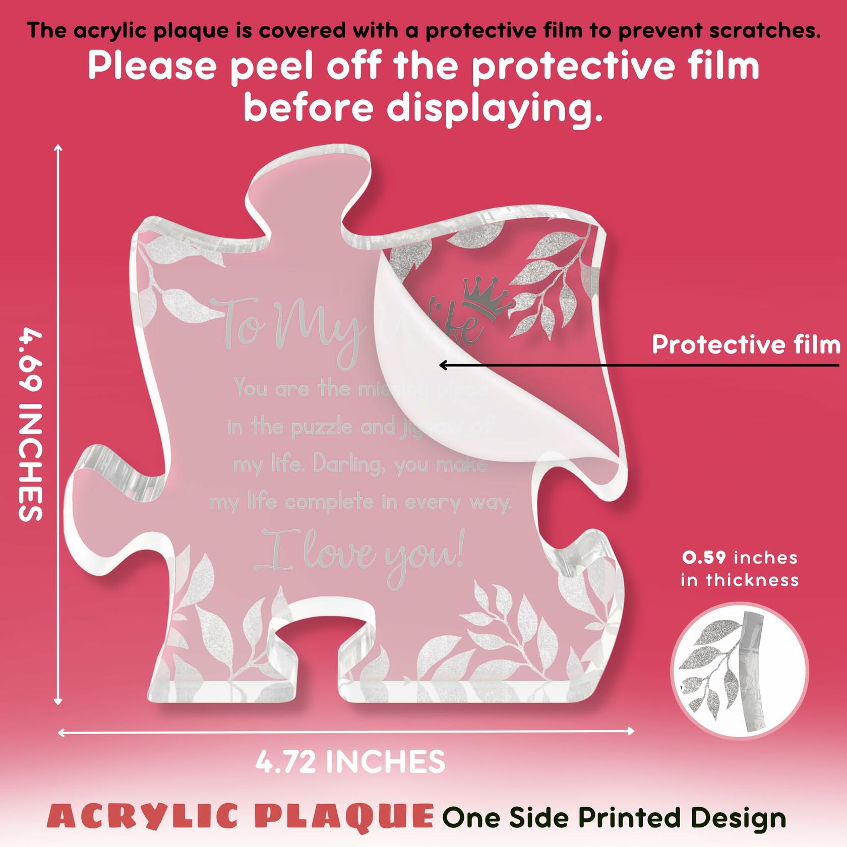 - PUZZLE-SHAPED ACRYLIC PLAQUE: A timeless and elegant gift, this to my wife acrylic plaque is sweet for commemorating special occasions. Measuring 4.72 inches/ 12.0 cm in height & width, and 0.59 inches/ 1.5 cm in thickness, this plaque is a beautifully proportioned piece that complements any decor.